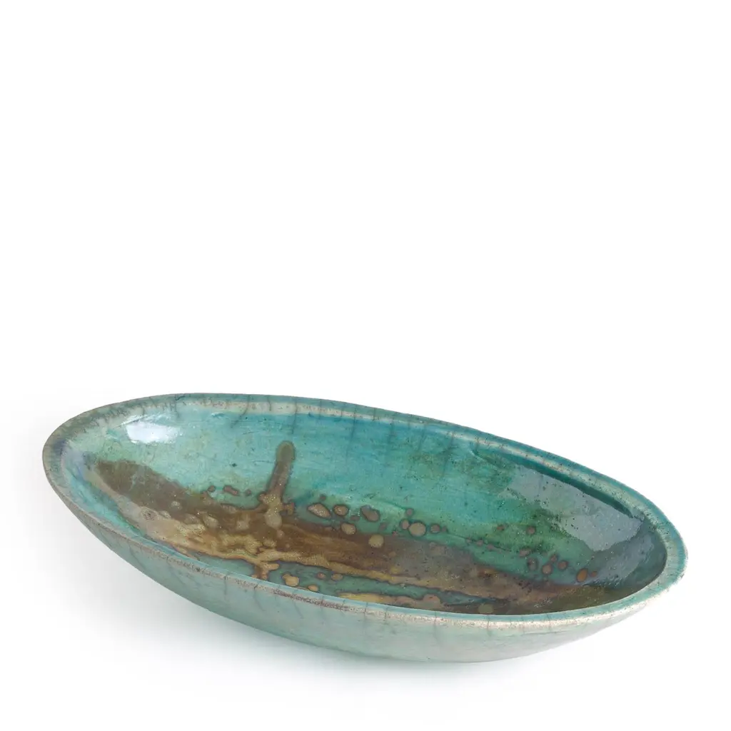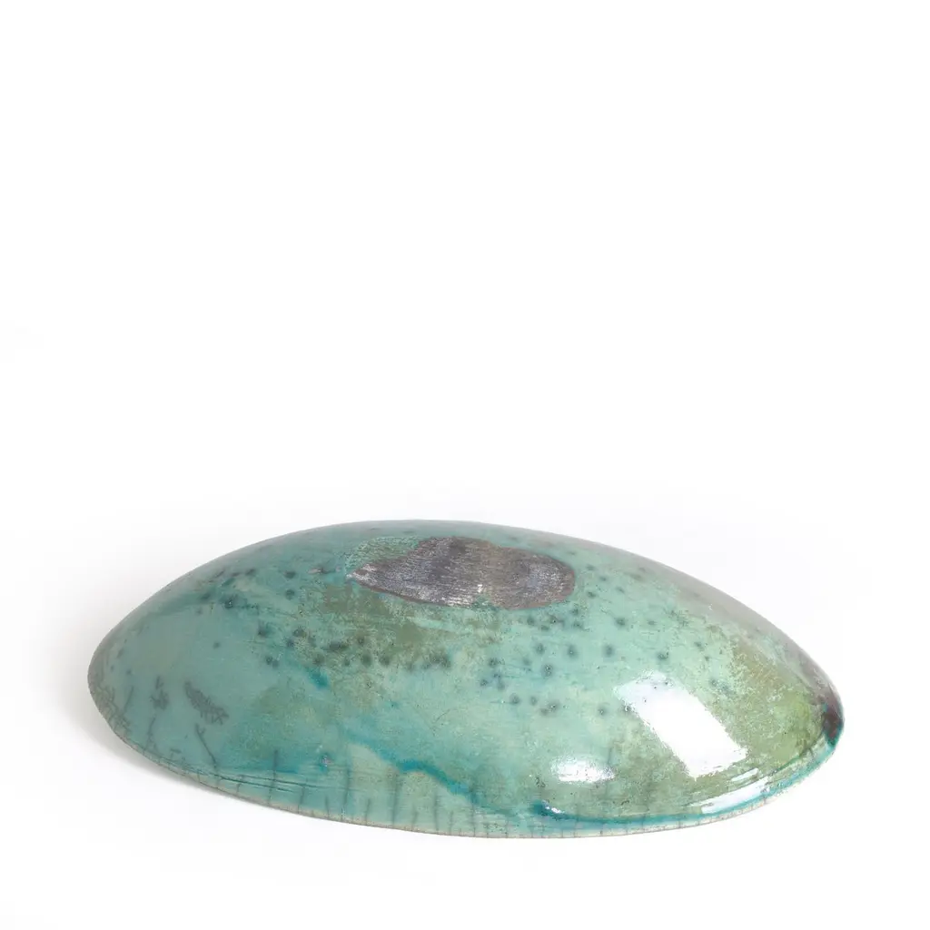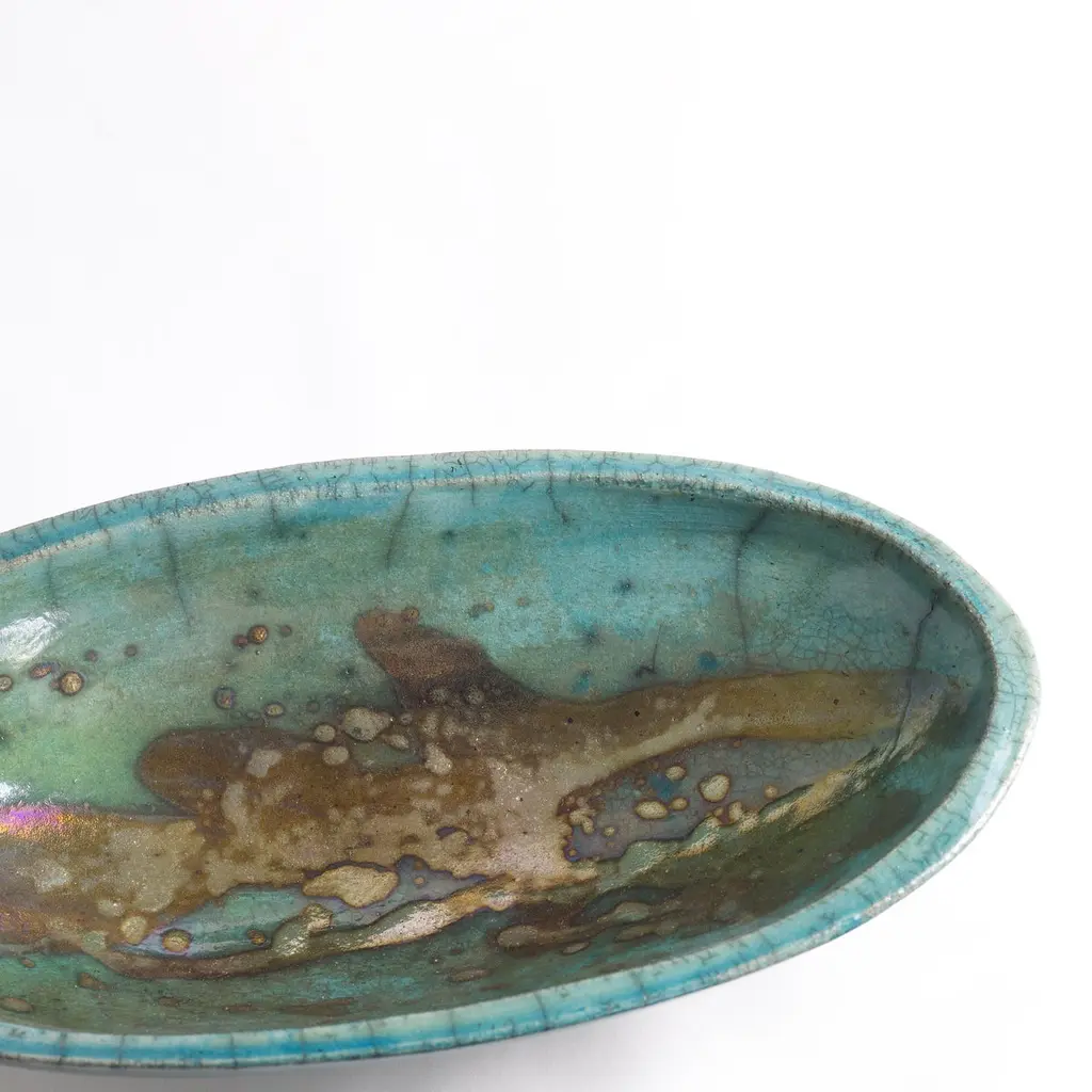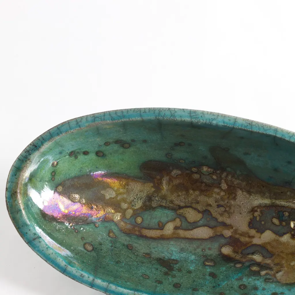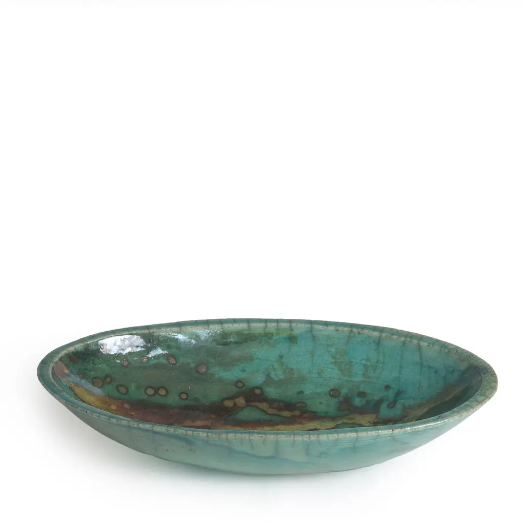 Japanese Modern Long Bowl Raku Ceramic Green Copper