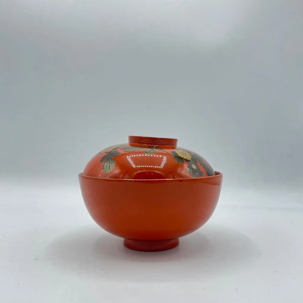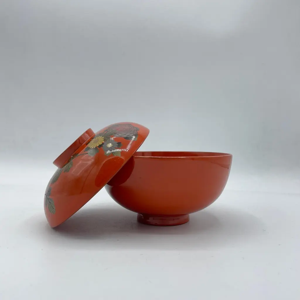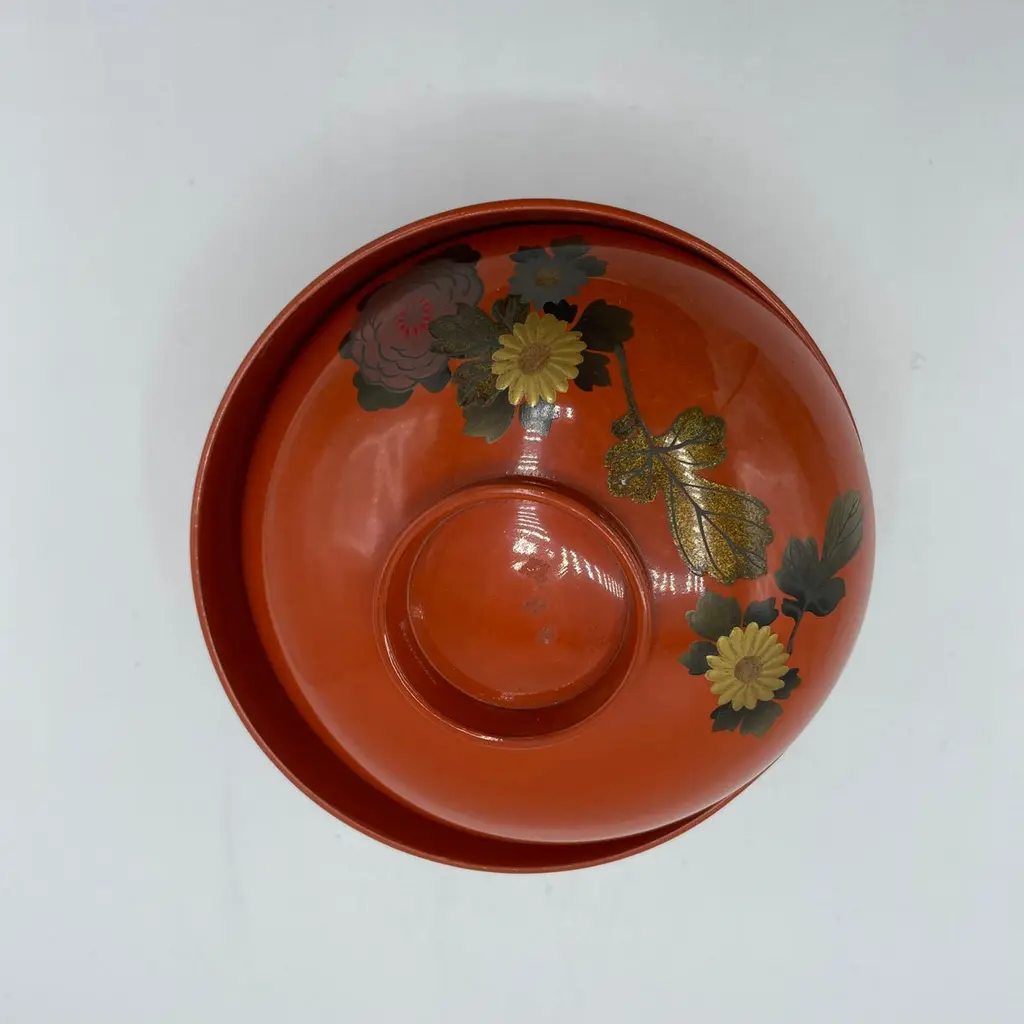 This red lacquer soup-bowl was made in Japan around 1970s in Showa era.This bowl is made with wood and there is a motif of flowers.Dimension: H9 × 12 × 12 cm