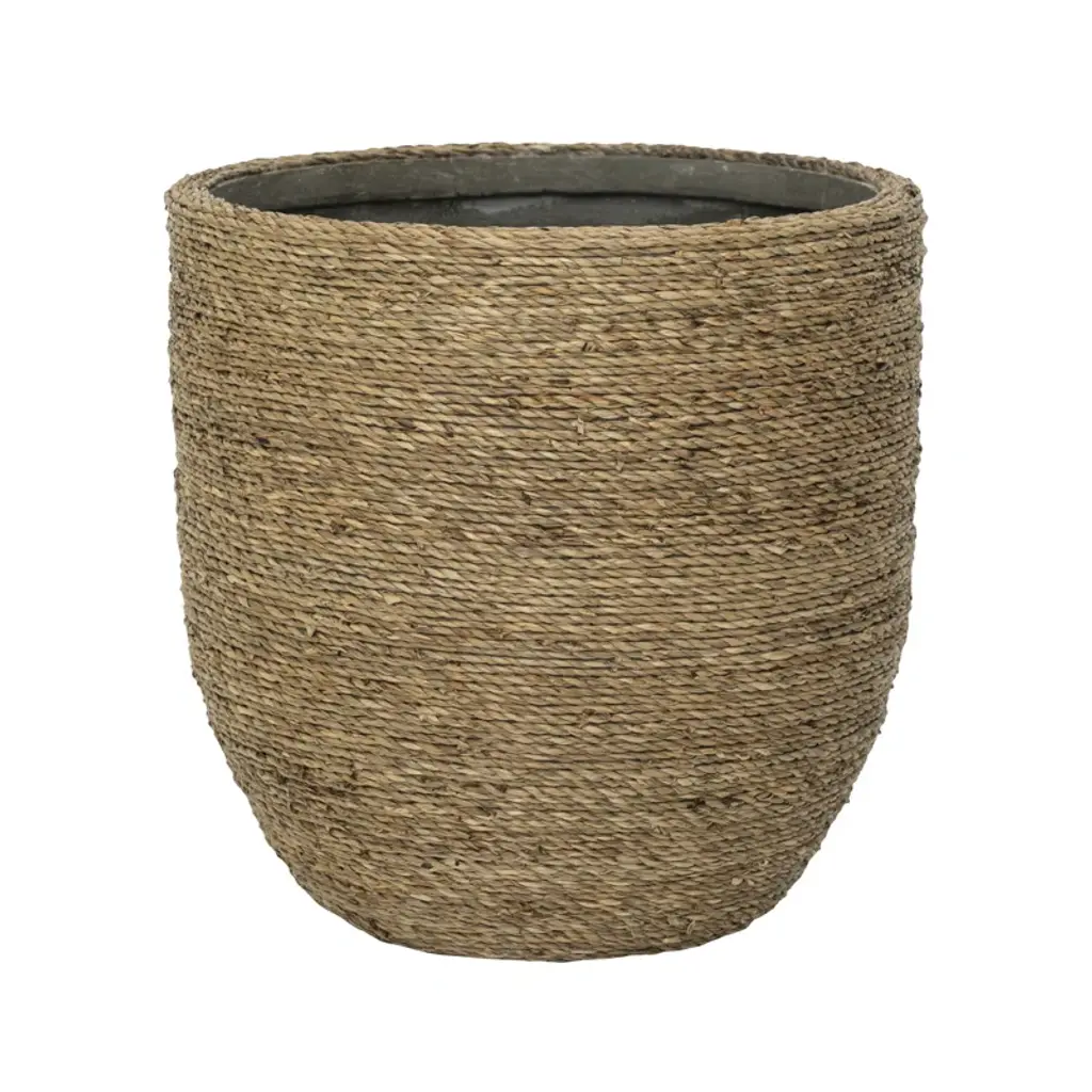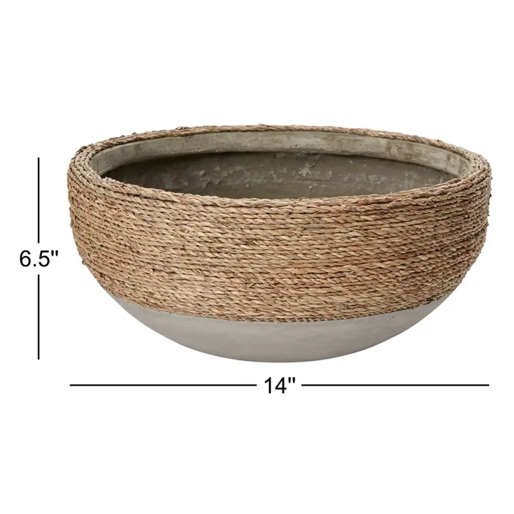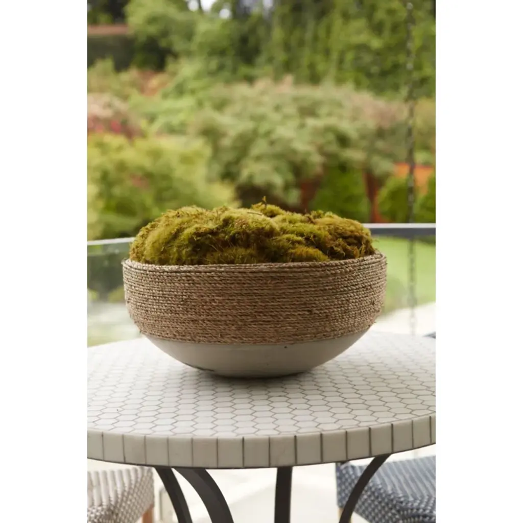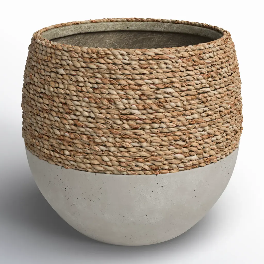 Extremely versatile and trend-forward, this collection is formed from lightweight concrete and features a wrapped neutral rope detail around the top. The mix of cool gray and warm tan in this container works with any outdoor style, boho or modern.