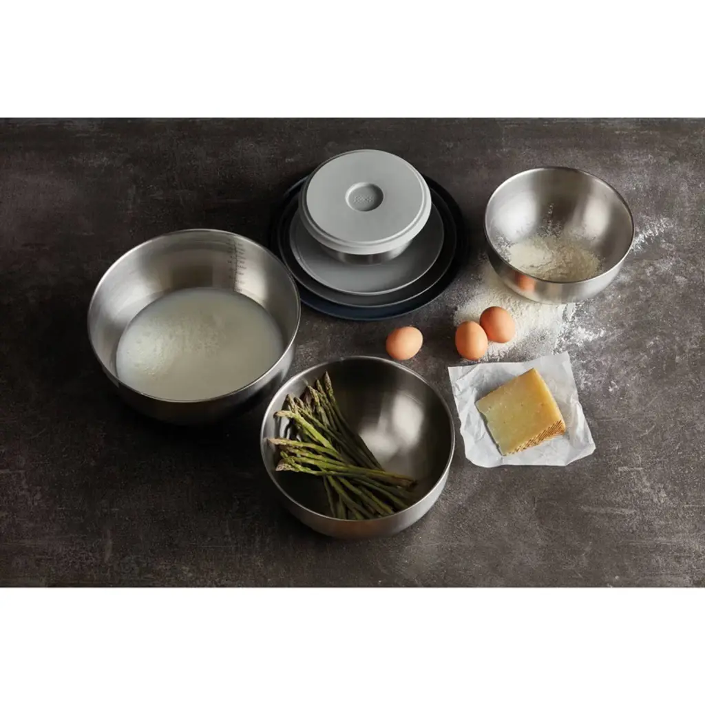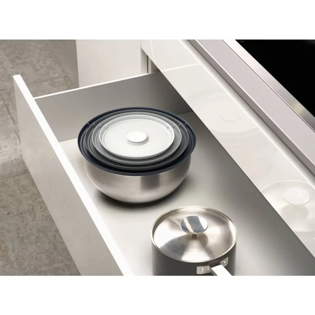 The Joseph Joseph 100 Collection is a unique range of products specially selected for their highly original form and innovative function. For this exclusive collection, each product has been redefined using premium materials and a restrained colour palette to create a distinctive range of contemporary kitchenware.The innovative design of this Nest™ 100 Prep&Store bowl set allows the individual elements to be stacked neatly together, thereby occupying the absolute minimum amount of space when stored. This versatile bowl set not only looks great but is ideal for a range of food preparation and storage tasks. Each bowl is made from high-quality 18/8 stainless steel and features easy-find, snap-together lids and non-slip bases.