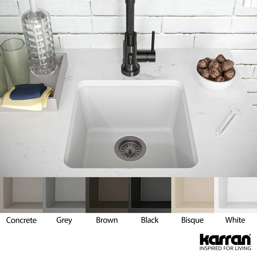 Upgrade your kitchen with the Karran Undermount Quartz Bar Single Bowl Sink. Made from a durable quartz composite material, this sink can handle the toughest daily kitchen tasks with ease. The non-porous material prevents the spread of bacteria and germs, making it easy to clean with just a cloth and soapy water. The sink is available in 6 elegant color options to enhance your kitchen decor. The 9" deep bowl with a side rear drain location provides ample space for all your cookware.Features:Specifications: