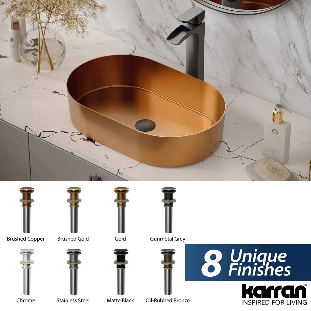 Constructed from durable brass, this stylish pop-up drain is compatible with any above-counter vessel sink without an overflow. Choose from multiple distinctive finishes to match your bathroom faucet. All rubber gaskets are included for a simple and hassle-free installationKarran PU25 Features:Karran PU25 Specifications: