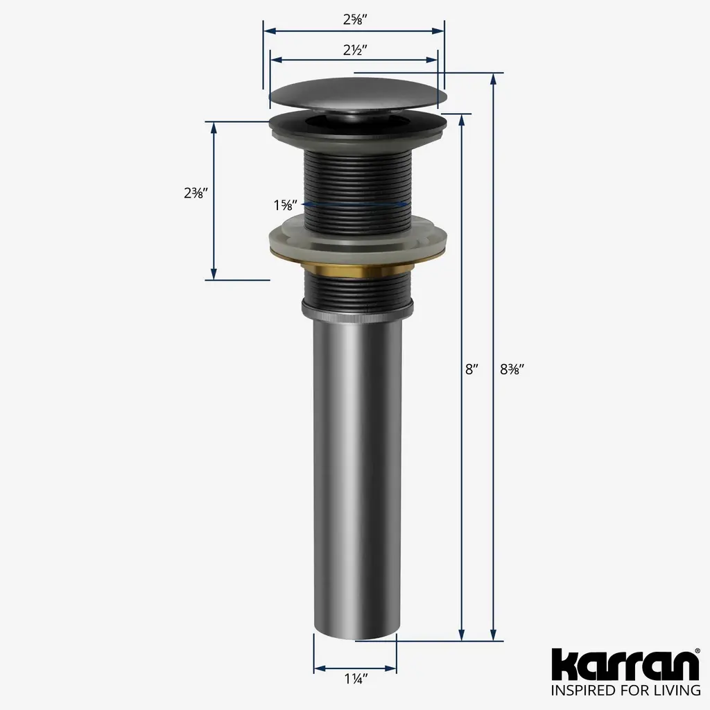 Constructed from durable brass, this stylish pop-up drain is compatible with any above-counter vessel sink without an overflow. Choose from multiple distinctive finishes to match your bathroom faucet. All rubber gaskets are included for a simple and hassle-free installationKarran PU25 Features:Karran PU25 Specifications:
