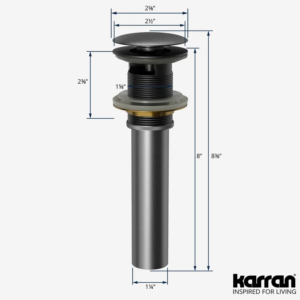 Constructed from durable brass, this stylish pop-up drain is compatible with all bathroom vanity sinks with an overflow. Choose from multiple distinctive finishes to match your bathroom faucet. All rubber gaskets are included for a simple and hassle-free installationKarran PUOF25 Features:Karran PUOF25 Specifications: