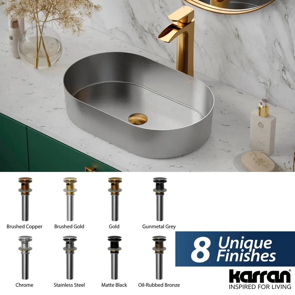 Constructed from durable brass, this stylish pop-up drain is compatible with all bathroom vanity sinks with an overflow. Choose from multiple distinctive finishes to match your bathroom faucet. All rubber gaskets are included for a simple and hassle-free installationKarran PUOF25 Features:Karran PUOF25 Specifications: