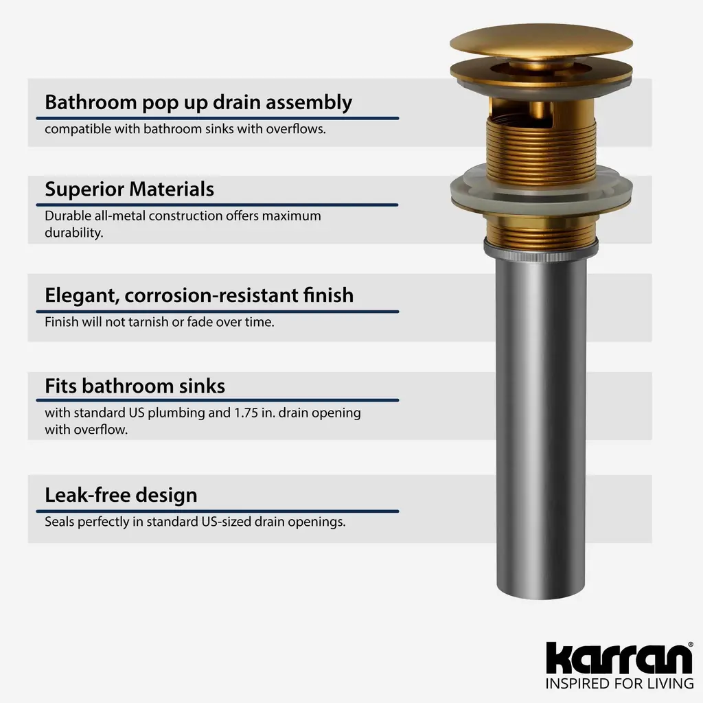 Constructed from durable brass, this stylish pop-up drain is compatible with all bathroom vanity sinks with an overflow. Choose from multiple distinctive finishes to match your bathroom faucet. All rubber gaskets are included for a simple and hassle-free installationKarran PUOF25 Features:Karran PUOF25 Specifications: