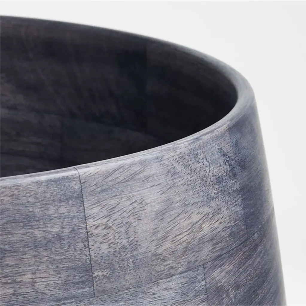A wash of black emphasizes the parquet grain of our mango wood centerpiece bowl for a rustic modern look. Elevated on a low pedestal, the bowl angles in to present seasonal botanicals or entryway essentials. Skilled artisans carve each bowl by hand, creating a staggered pattern of wood grain. A Crate & Barrel exclusive, our Katin black wood centerpiece bowl pairs well with its smaller white counterpart.