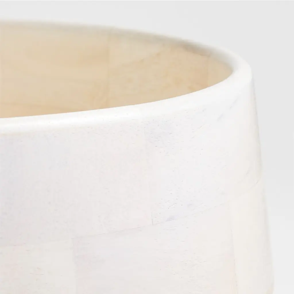 A wash of white emphasizes the parquet grain of our mango wood centerpiece bowl for a rustic modern look. Elevated on a low pedestal, the bowl angles in to present seasonal botanicals or entryway essentials. Skilled artisans carve each bowl by hand, creating a staggered pattern of wood grain. A Crate & Barrel exclusive, our Katin white wood centerpiece bowl pairs well with its larger black counterpart.