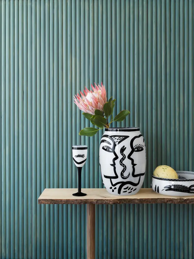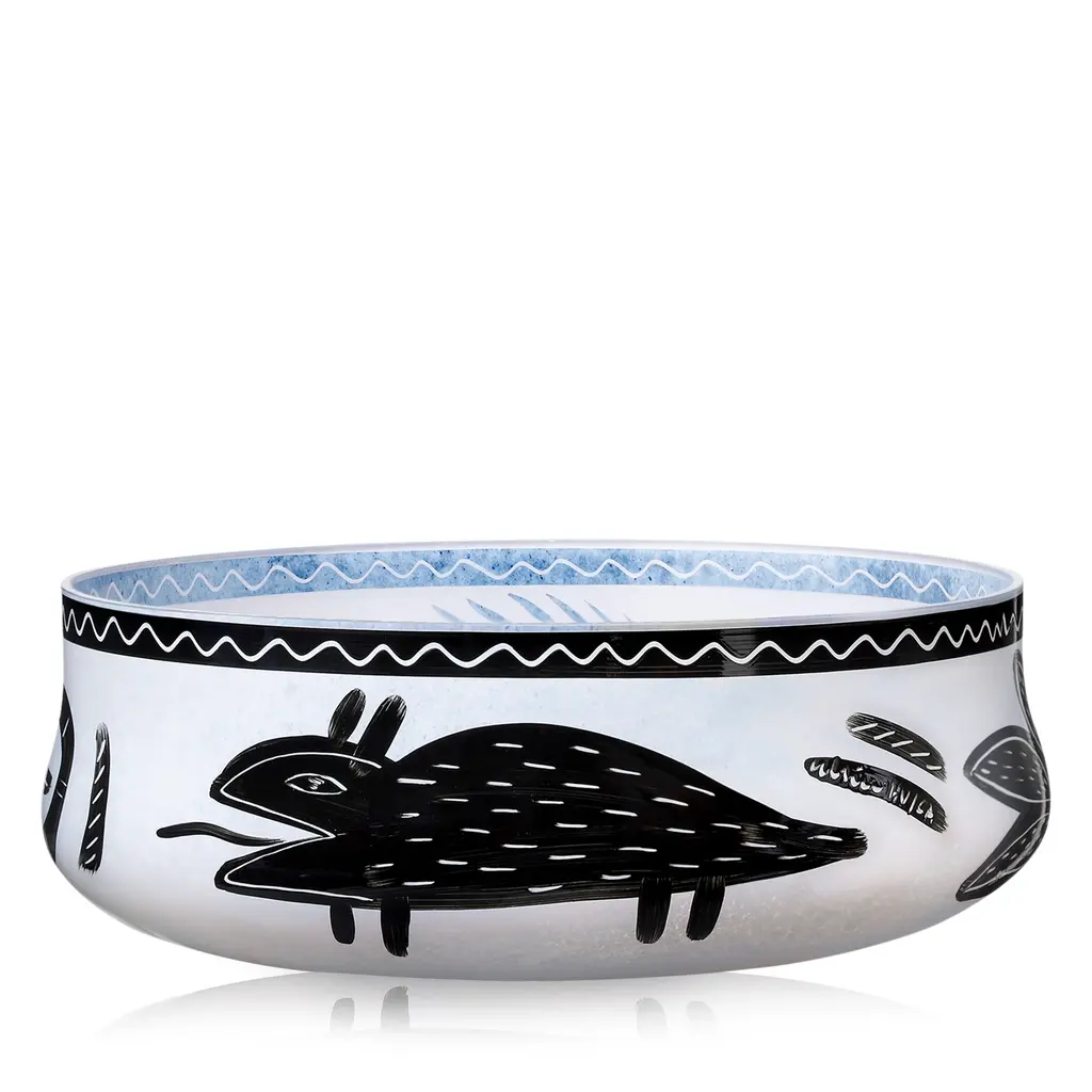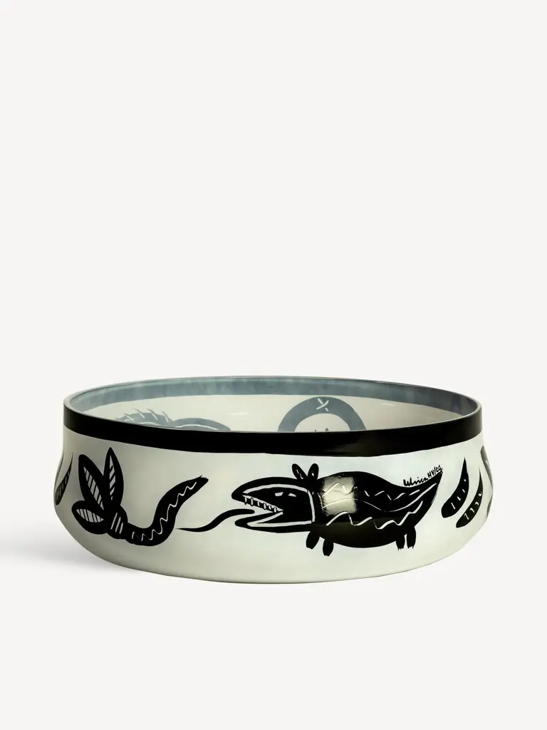 Caramba from Kosta Boda is inspired by Mexico. “¡Ay, caramba!” is a bold statement that contributes to the power of the hand-painted black details on this mouth-blown dish: slithering snakes, jumping fish, and wildly blossoming flowers. The bowl is mouth-blown in Kosta, Sweden. Design by Ulrica Hydman Vallien.