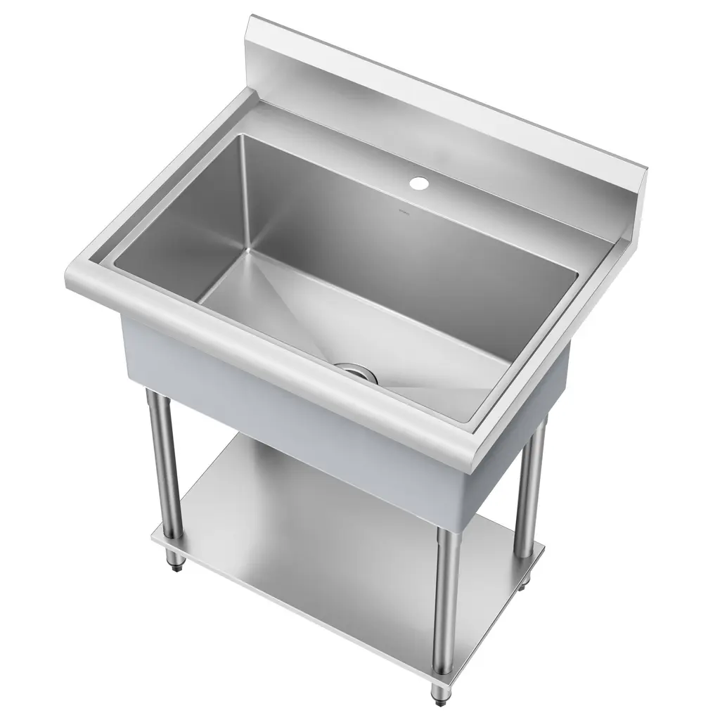 Built for heavy-duty use, the Standart Pro Freestanding Utility Sink is perfect for laundry rooms, mudrooms, or as a kitchen sink in commercial settings. Durable 18-gauge stainless steel sink resists dents and corrosion. The 12 in deep sink handles large tasks like washing pets or cleaning oversized items, while a sloped bottom with channel grooves improves drainage. Unlike a laundry sink that requires wall-mount faucet, this stainless steel utility sink works with any single-hole kitchen faucet. Laundry utility sink features built-in storage shelf and adjustable legs with plastic feet for stability. NoiseDefend sound dampening, wear-resistant commercial sink finish, and easy-clean rounded corners make this a quiet low-maintenance solution.