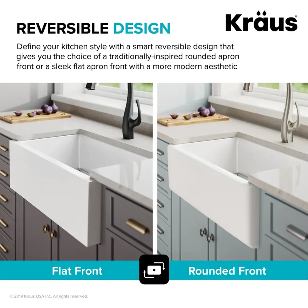 Kraus Turinotm Reversible 33-Inch L Fireclay Farmhouse Flat Apron Front Single Bowl Kitchen Sink With Bottom Grid