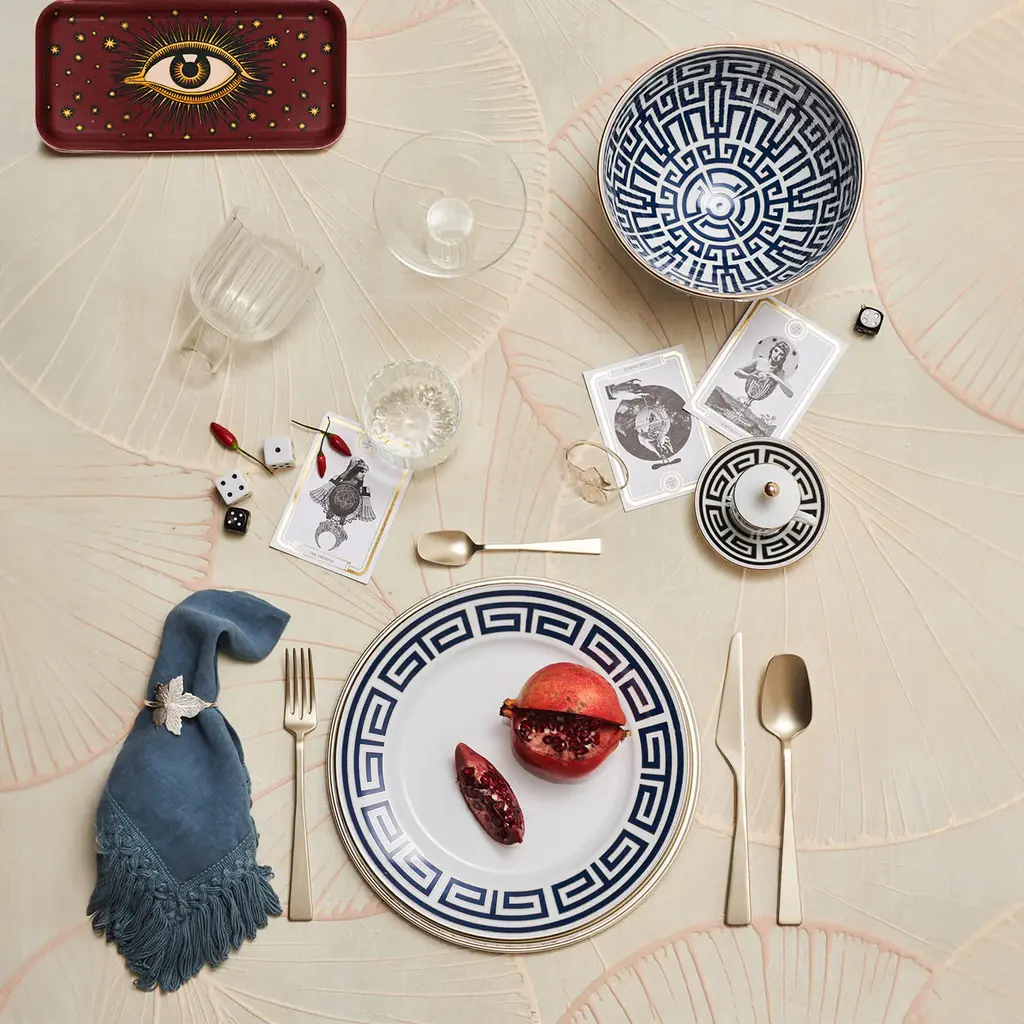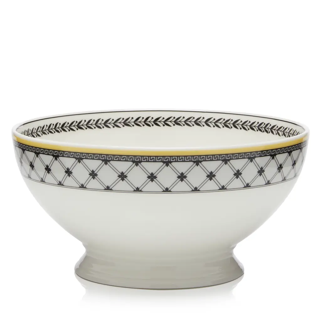This bowl will enrich every table and it can be combined with other items in the same Labirinto collection for a cohesive look and magnificent effect. Crafted entirely of porcelain, each piece boasts a pure white background delicately adorned with geometric decoration in blue, with a rim in gold. This stylized maze-like decoration was created in 1926 by iconic designer Gio Ponti.
