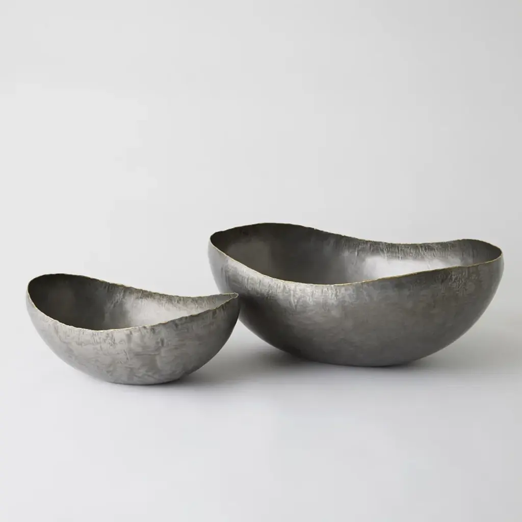 Brutalist iron centerpiece bowl with the braised brass accent on edges. The bowl is sealed with a matte lacquer to retard oxidation.