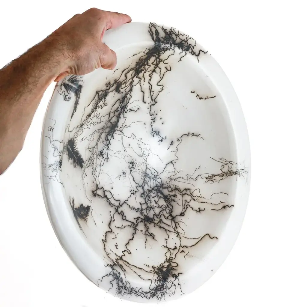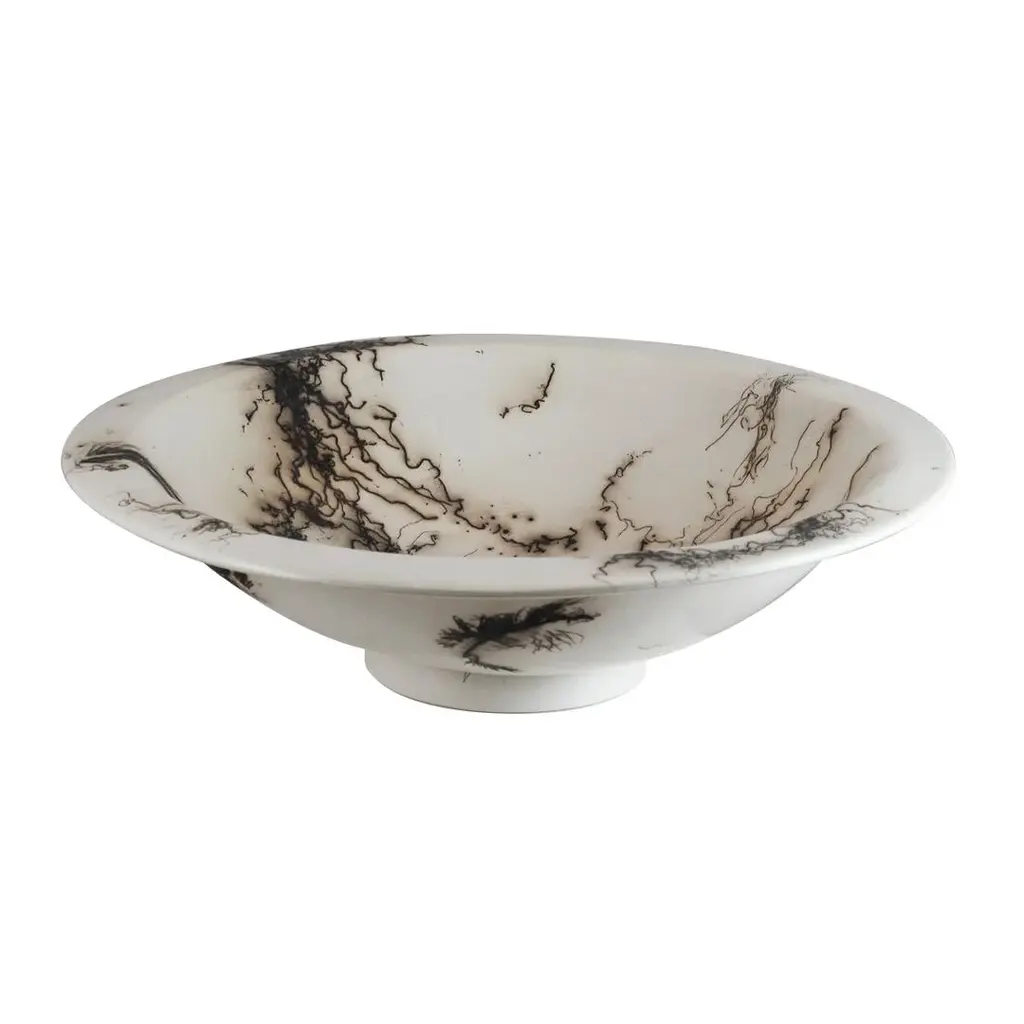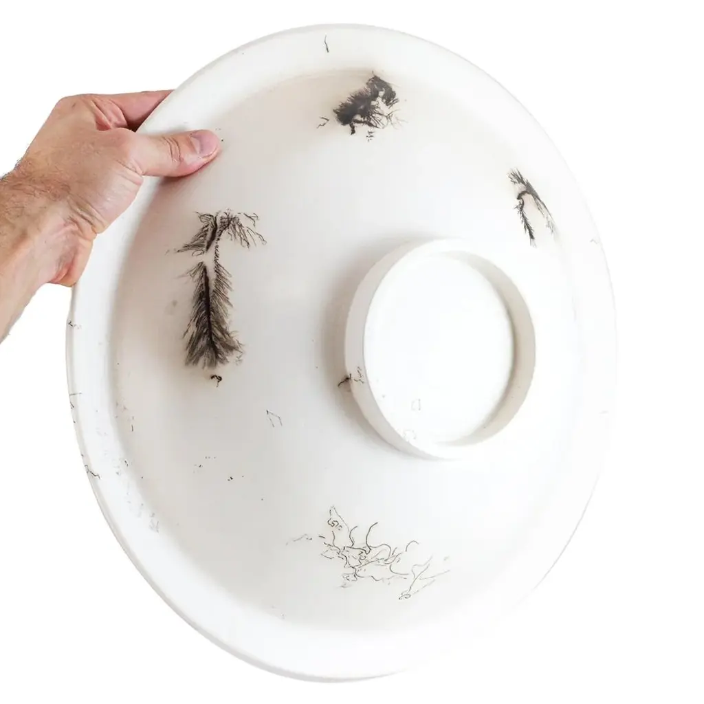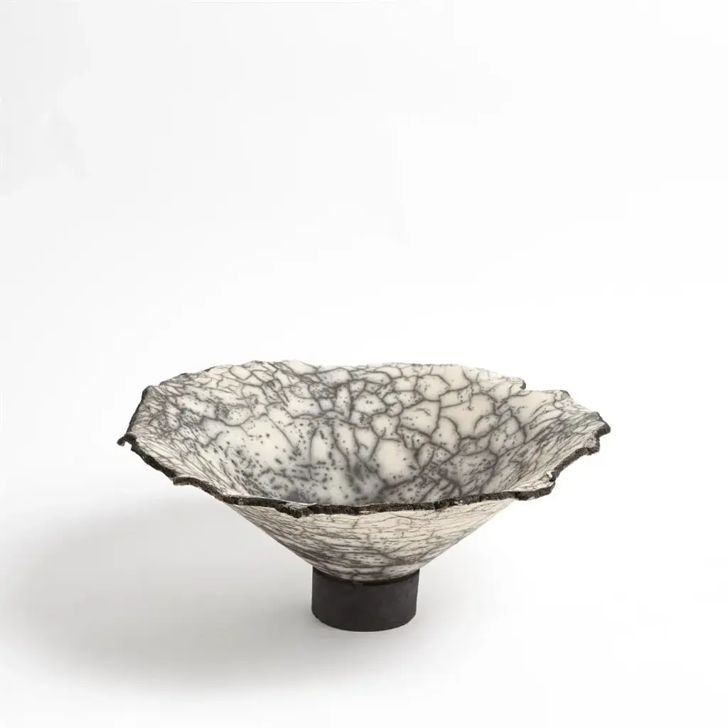 Bowl Large is made of ceramic using the horsehair technique. The Bowl is created entirely by hand and is finished on the potter's wheel to give it a nice, smooth appearance. Three layers of sealed earth are applied to the surface to increase its luminosity. Each Bowl Large is fired twice, the first time called a "cookie" and the second time on the Raku kiln. The surface is unglazed to ensure a natural and elegant appearance. Stamped by Maker