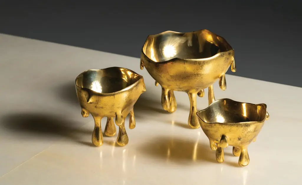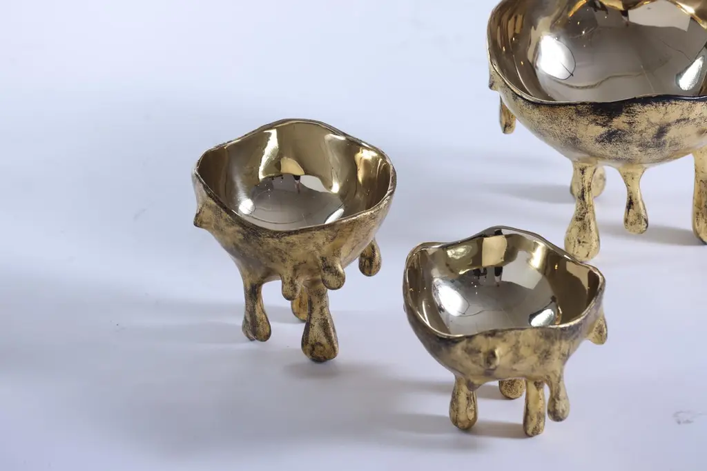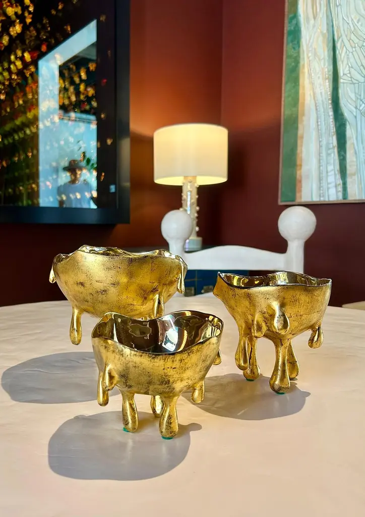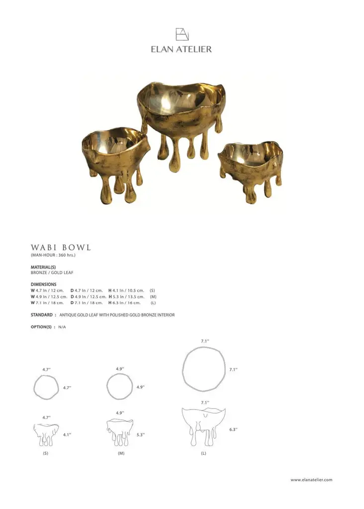 Wabi Bowl, Large, by Elan AtelierWabi bowl in solid cast bronze using the lost wax cast method. Exterior finish in gold leaf with dark patina. Interior finish in polished gold. Available in three standard sizes. This listing is for the large size.Small/w 4.7 x d 4.7 x h 4.1 inw 12 x d 12 x h 10.5 cmMedium/w 4.9 x d 4.9 x h 5.3 inw 12.5 x d 12.5 x h 13.5 cmLarge/w 7.1 x d 7.1 x h 6.3 inw 18 x d 18 x h 16 cmProduction time: Ten weeksShipping time to the USA: Two weeks by air or ten weeks by seaWordwide air shipping: Two weeks