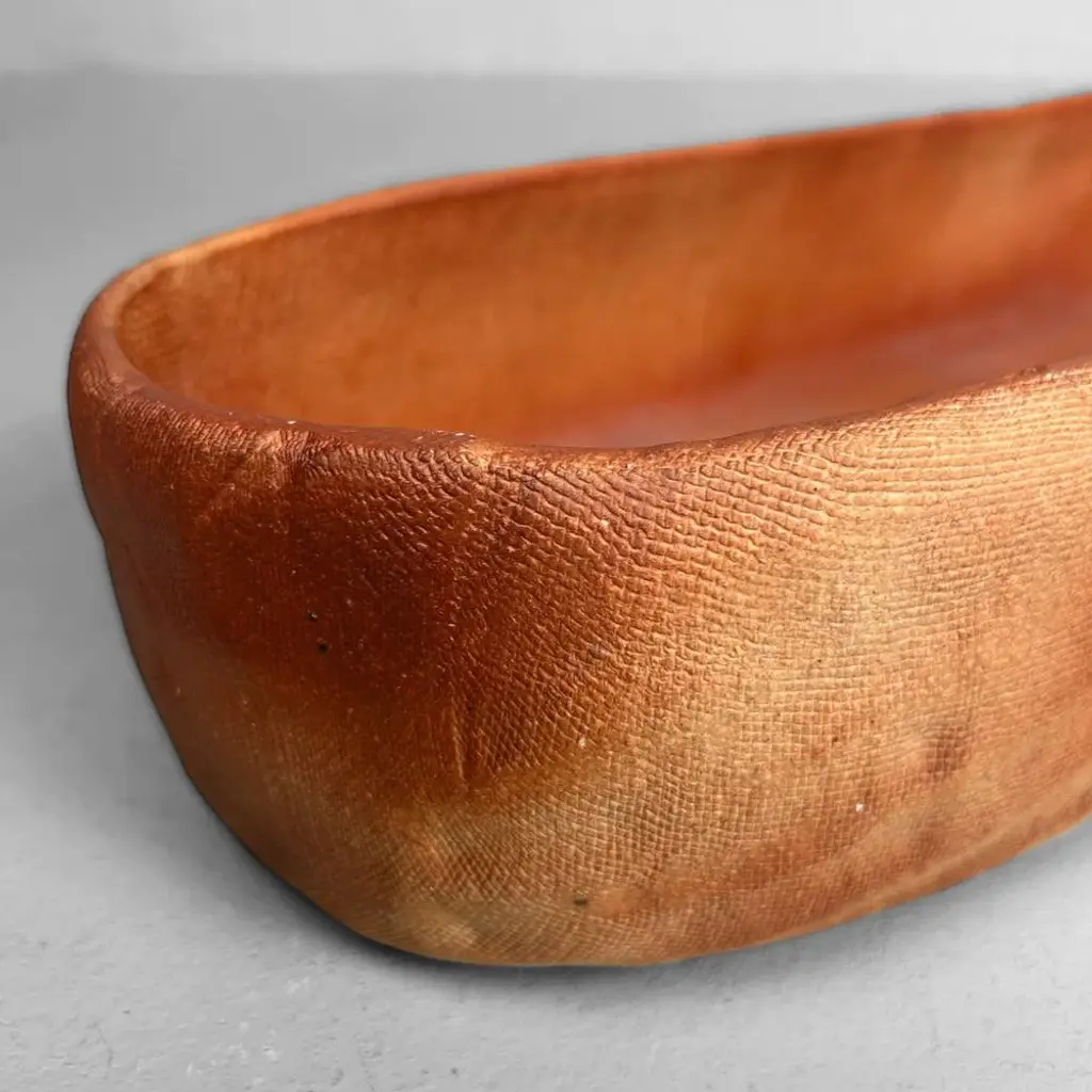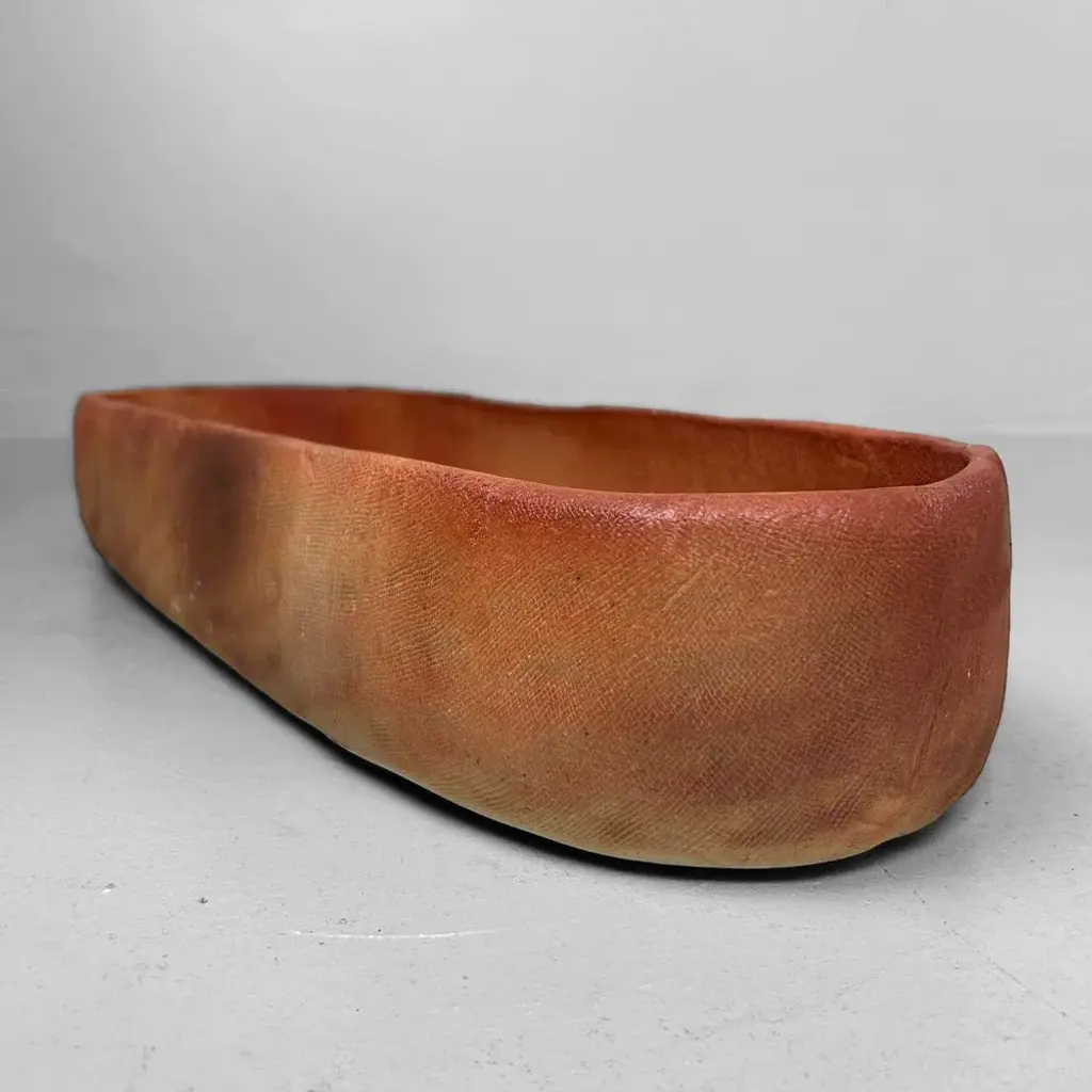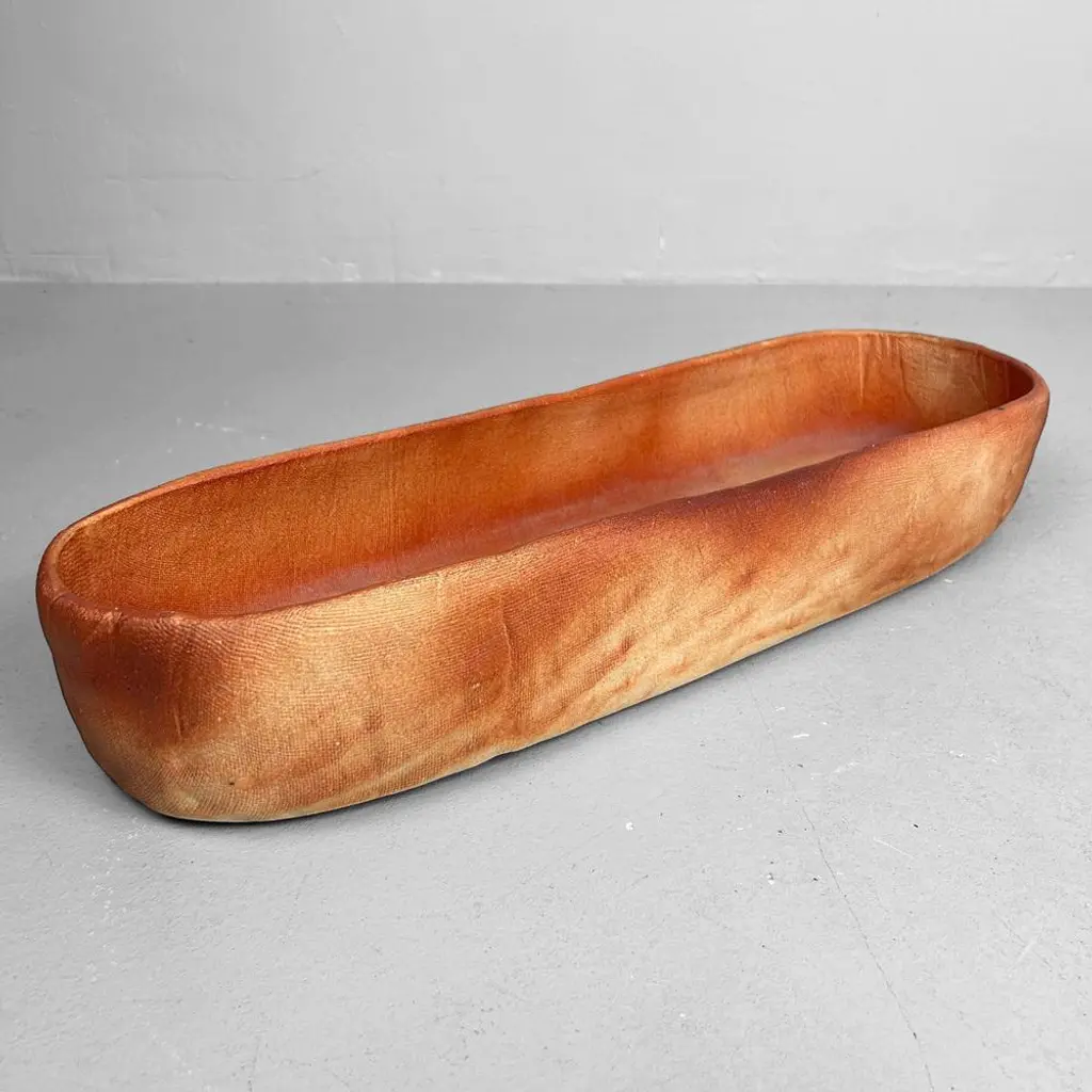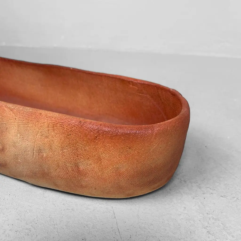 A beautiful and rare Japanese ceramic bowl, signed on the underside and crafted in the 1960s – a period in which traditional Japanese ceramics embraced new forms of artistic expression. Dimensions: height 9.5 cm, width 54 cm, depth 17 cm. In excellent condition, with signature. The bowl features an elongated, organic form. Its surface reveals a deep, earthy reddish-brown color with subtle tonal variations and a lively texture reminiscent of coarse woven textile. This natural appearance is the result of the traditional firing process, where each nuance and irregularity lends unique character. Traditionally, bowls of this kind were used as ikebana basins (suiban) – low vessels in which floral compositions were arranged according to the art of ikebana. Thanks to its generous size, the bowl today makes an impressive centerpiece, perfect for displaying fruit or nuts, yet equally striking as a purely decorative object. A powerful interior accent that embodies the aesthetics of wabi-sabi: beauty in simplicity, impermanence, and imperfection. An exceptional piece of Japanese ceramics that is both functional and sculptural – a refined addition to any interior and a valuable collectible for admirers of Japanese craftsmanship and vintage design.