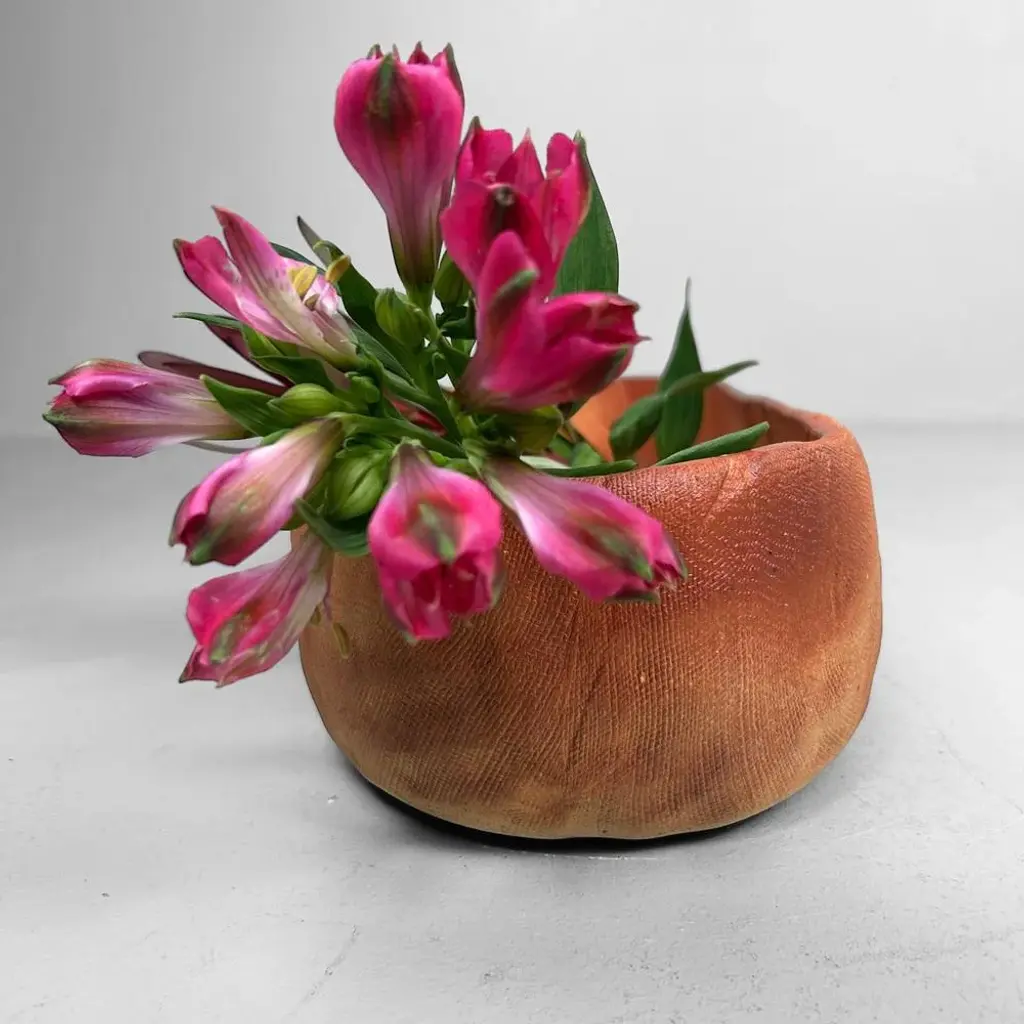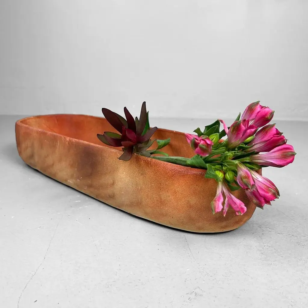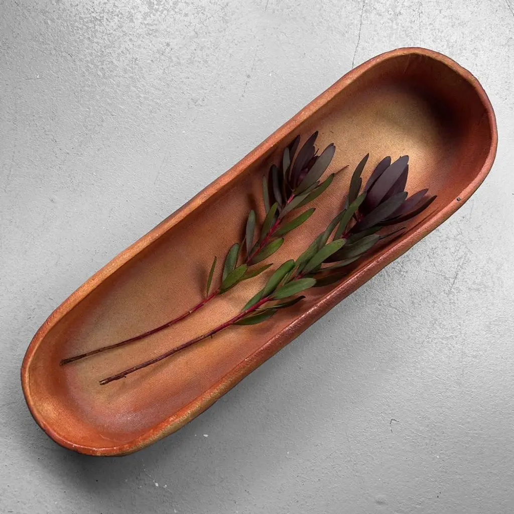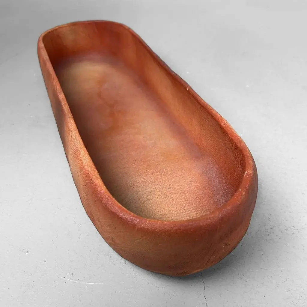 A beautiful and rare Japanese ceramic bowl, signed on the underside and crafted in the 1960s – a period in which traditional Japanese ceramics embraced new forms of artistic expression. Dimensions: height 9.5 cm, width 54 cm, depth 17 cm. In excellent condition, with signature. The bowl features an elongated, organic form. Its surface reveals a deep, earthy reddish-brown color with subtle tonal variations and a lively texture reminiscent of coarse woven textile. This natural appearance is the result of the traditional firing process, where each nuance and irregularity lends unique character. Traditionally, bowls of this kind were used as ikebana basins (suiban) – low vessels in which floral compositions were arranged according to the art of ikebana. Thanks to its generous size, the bowl today makes an impressive centerpiece, perfect for displaying fruit or nuts, yet equally striking as a purely decorative object. A powerful interior accent that embodies the aesthetics of wabi-sabi: beauty in simplicity, impermanence, and imperfection. An exceptional piece of Japanese ceramics that is both functional and sculptural – a refined addition to any interior and a valuable collectible for admirers of Japanese craftsmanship and vintage design.