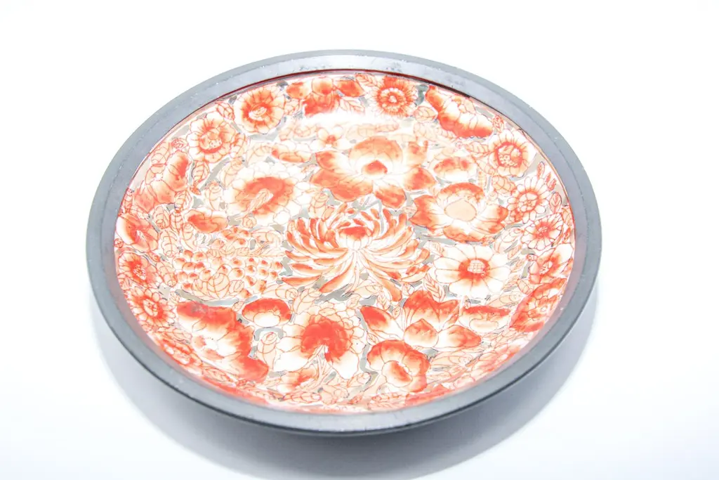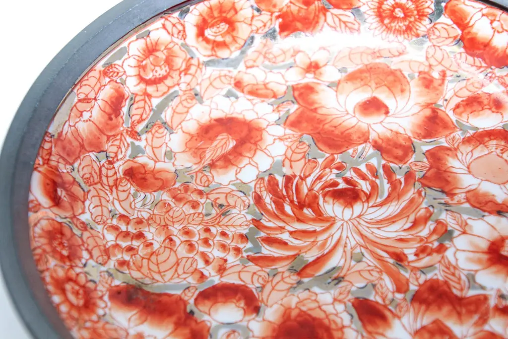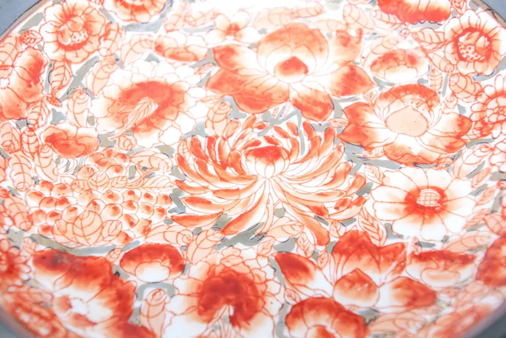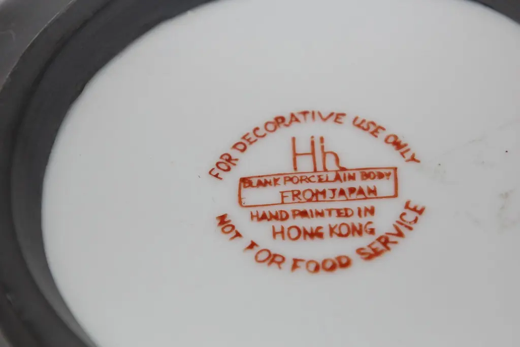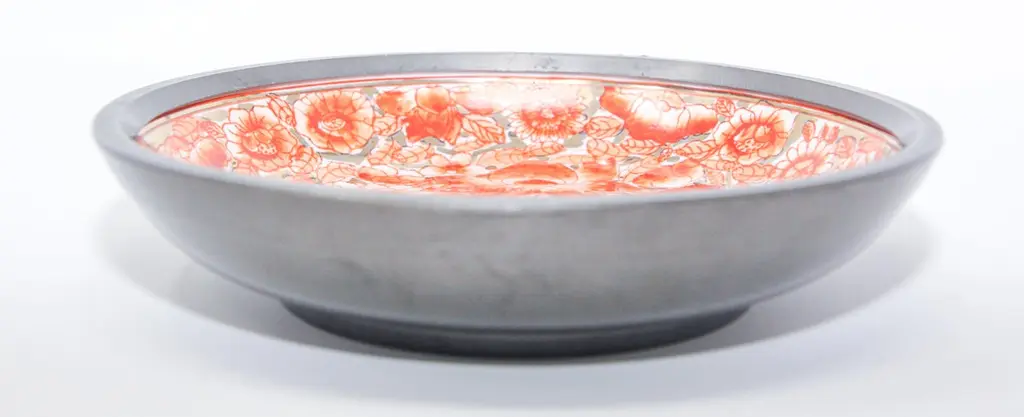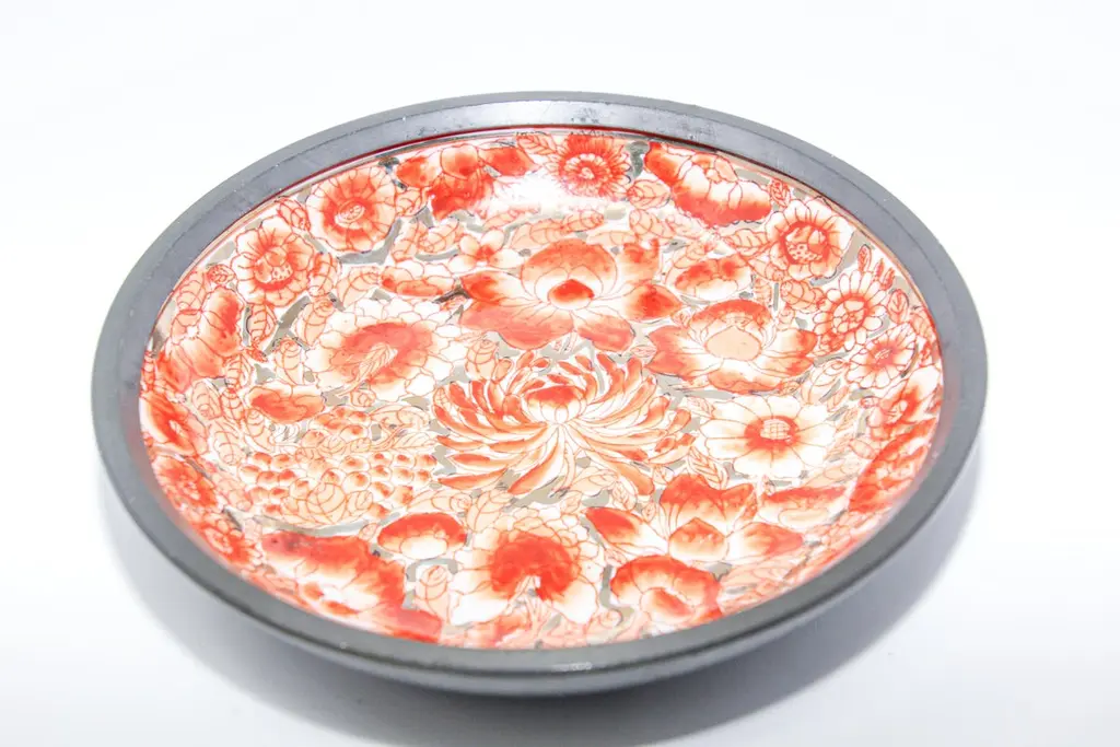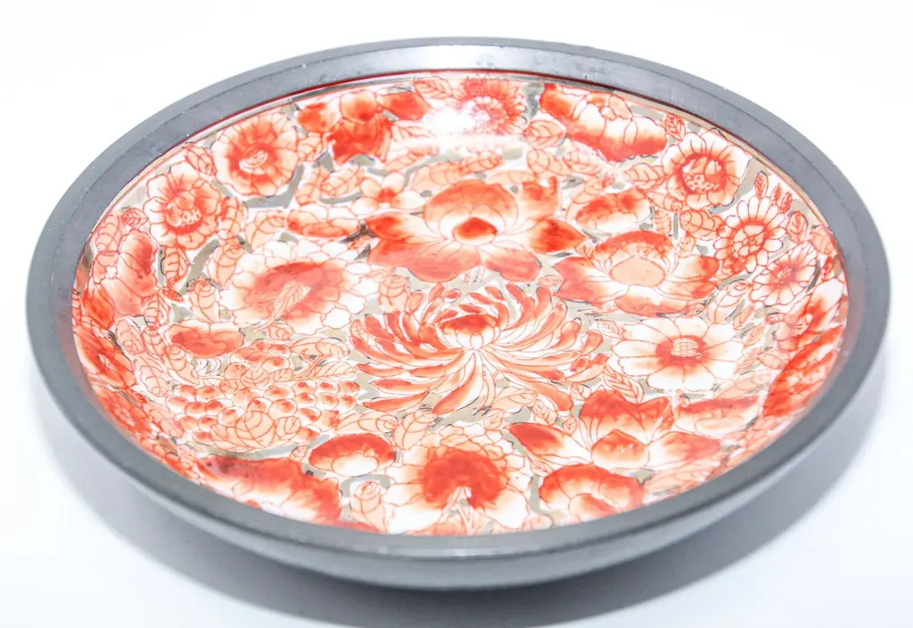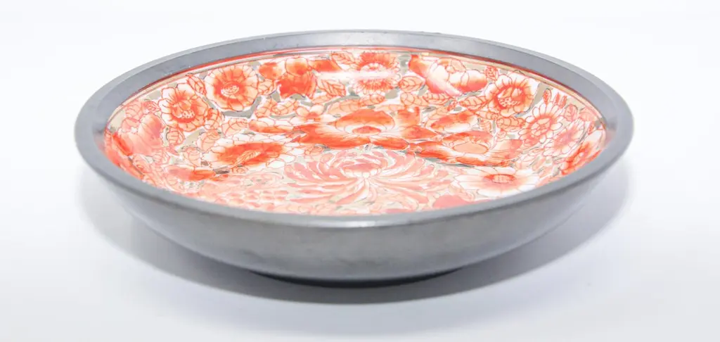 Large vintage red and white porcelain bowl catchall encased in pewter.Floral design with gold accents hand painted in Hong Kong on a white porcelain bowl made in Japan encased in pewter.Made in Hong Kong in the 1970s.Use as a catchall or decorative bowl.Marked on the bottom.
