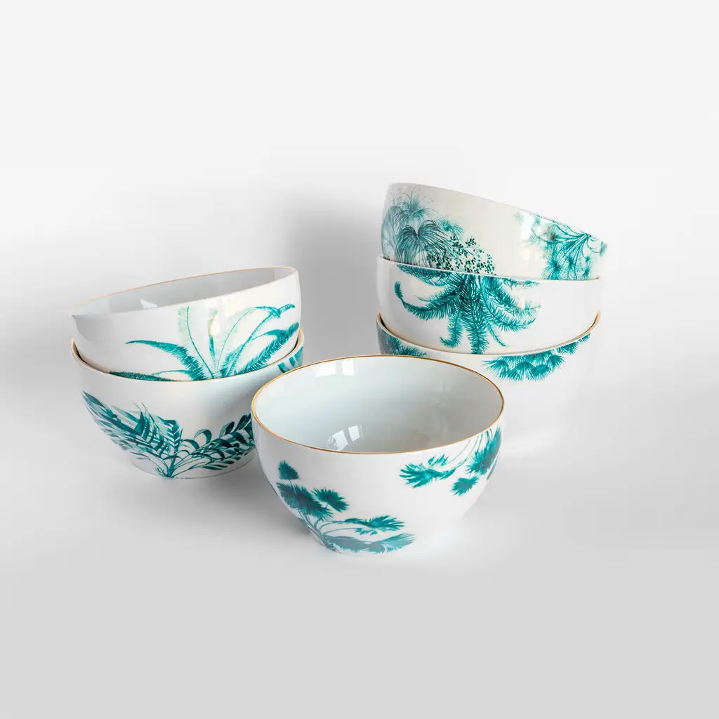 This exquisite bowl is part of the Las Palmas Collection, a series of six different designs introduced at Maison&Object 2019 in Paris. Entirely crafted of fine porcelain, this piece boasts elegant curves, a refined gold rim, and a superb depiction of palm leaves in vivid shades of green and turquoise. This colorful and stunning object of functional decor can be used as a display container in a living room, vide poche in an entryway, or as a cup to serve hot beverages in a dining room. For a striking effect, it can be paired with the other designs in the series.