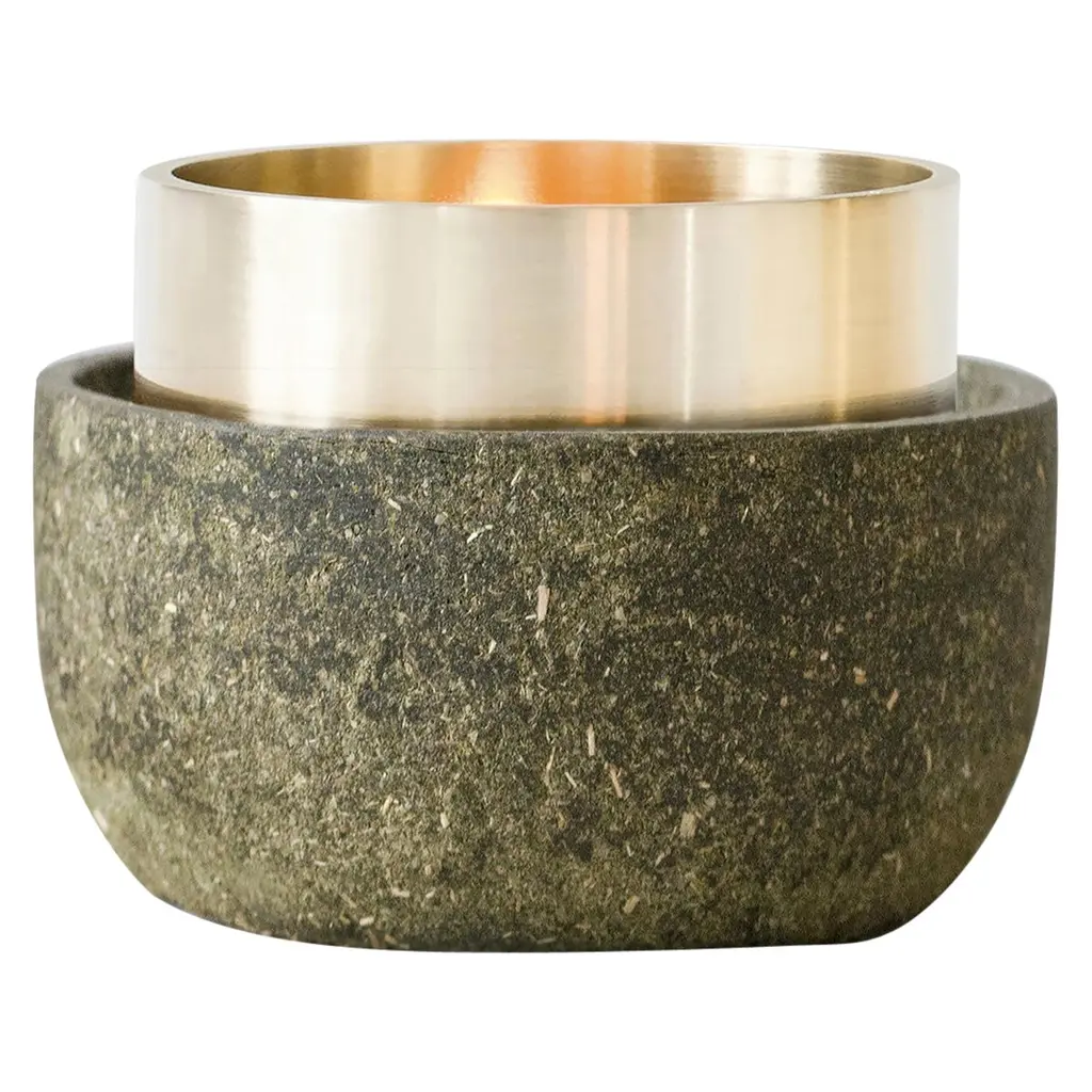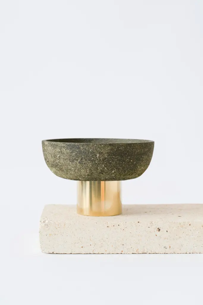 Leaves pedestal bowl by Evelina Kudabaite StudioHandmadeMaterials: tree leaves, brassDimensions: H 7.5 x D 12 cmColour: green/khakiNotes: for dry useSince 2015, product designer Evelina Kudabaite keeps on developing and making GIRIA objects. Designer firsthomeware collection launched in 2015 during the London Design Festival. Everyday objects are used, seen, touched. Tactility and expressive qualities of materials have important communicative value, so the design process requires for intense research on textures. GIRIA is a homeware collection balancing between tactility, shape and color. The project is aimed to pass the sensations of the forest through material, to establish a connection between the user and the object. This collection is result of an experimental process by which it was meant to show how materials, which are destined to become waste - tree bark and leaves - can be transformed into sustainable design through the traditional crafts.It is a research on the alternative and unconventional ways to shape wood, which reminds of the culinary process. During the research a recipe of a unique material that consists of harmless organic substances has been found. No two items in GIRIA are the same: each is made by hand and the bark dust of different kinds of trees gives a unique texture, varying in colour and roughness of a surface. It takes time to make a piece in GIRIA, that is considering preparation of the bark, drying time - from days, to weeks - and variability of the process. All the items are coated with mix of foodsafe oils to make it more durable. The materials in GIRIA may change slowly over time and the collection distinguishes itself from mass production, making the products as individual as their owners.Evelina is a product designer based in Vilnius, Lithuania. Her research usually starts from materials and processes which transform them into design objects. She is fascinated by the narrative hidden in a product and by its power of carrying knowledge, memories and emotions in a more concrete and tactile way. When designing something, she wants to tell a story, to create a reaction of wonder and curiosity in the people who are going to interact with the object.