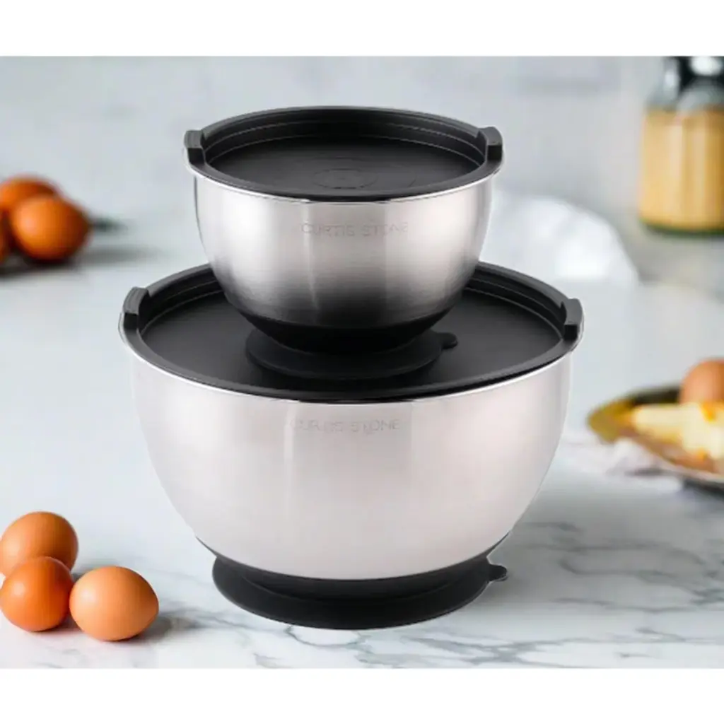 A must-have for chefs and bakers, our resilient stainless steel bowls are a valuable addition to any kitchen. These cutting-edge bowls feature a built-in silicone suction cup bottom for stability, enabling you to pour ingredients and mix simultaneously. Whether you have leftover mixture or need to marinate chicken overnight, the two included plastic lids allow you to cover each bowl and store it conveniently on the counter or in the fridge for later use.