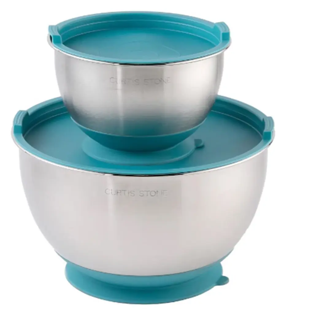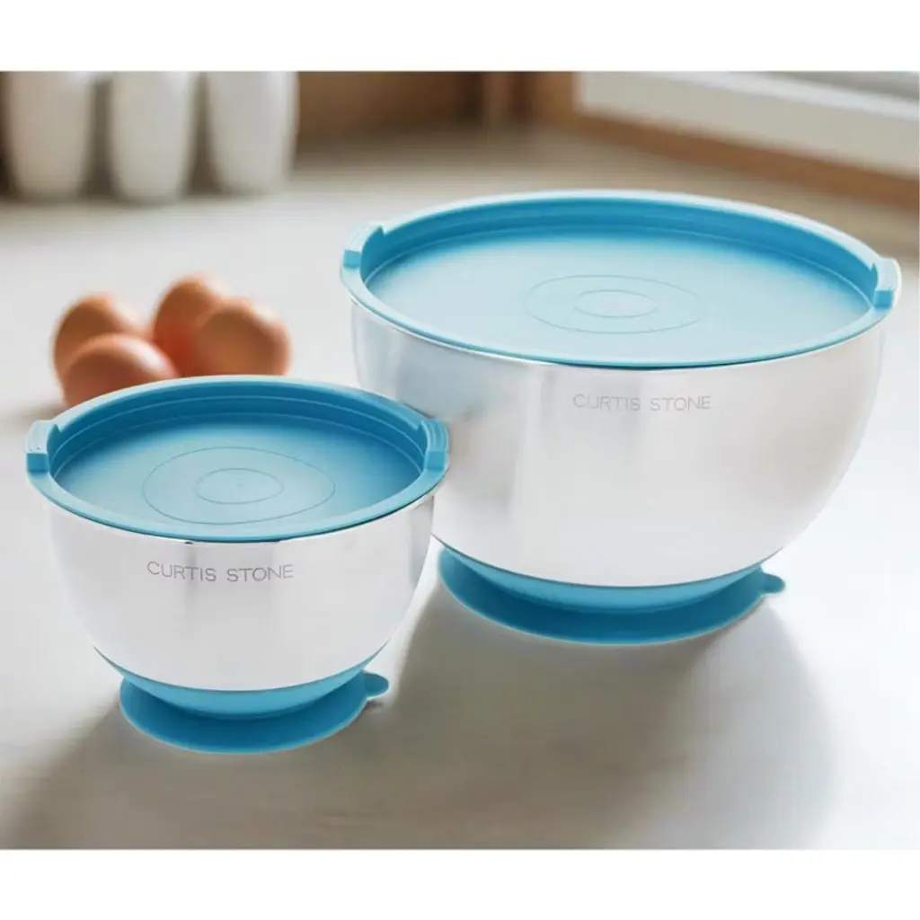A must-have for chefs and bakers, our resilient stainless steel bowls are a valuable addition to any kitchen. These cutting-edge bowls feature a built-in silicone suction cup bottom for stability, enabling you to pour ingredients and mix simultaneously. Whether you have leftover mixture or need to marinate chicken overnight, the two included plastic lids allow you to cover each bowl and store it conveniently on the counter or in the fridge for later use.