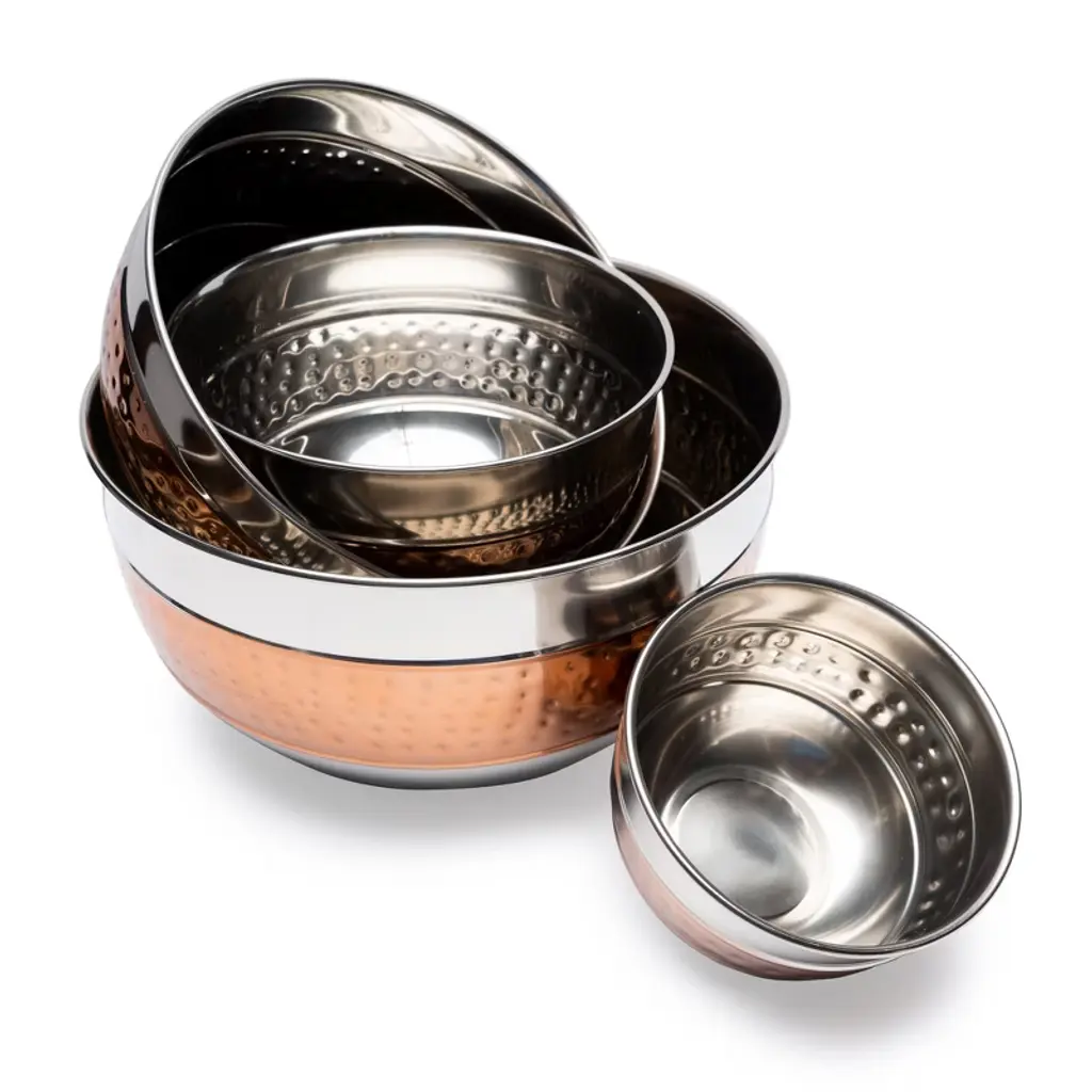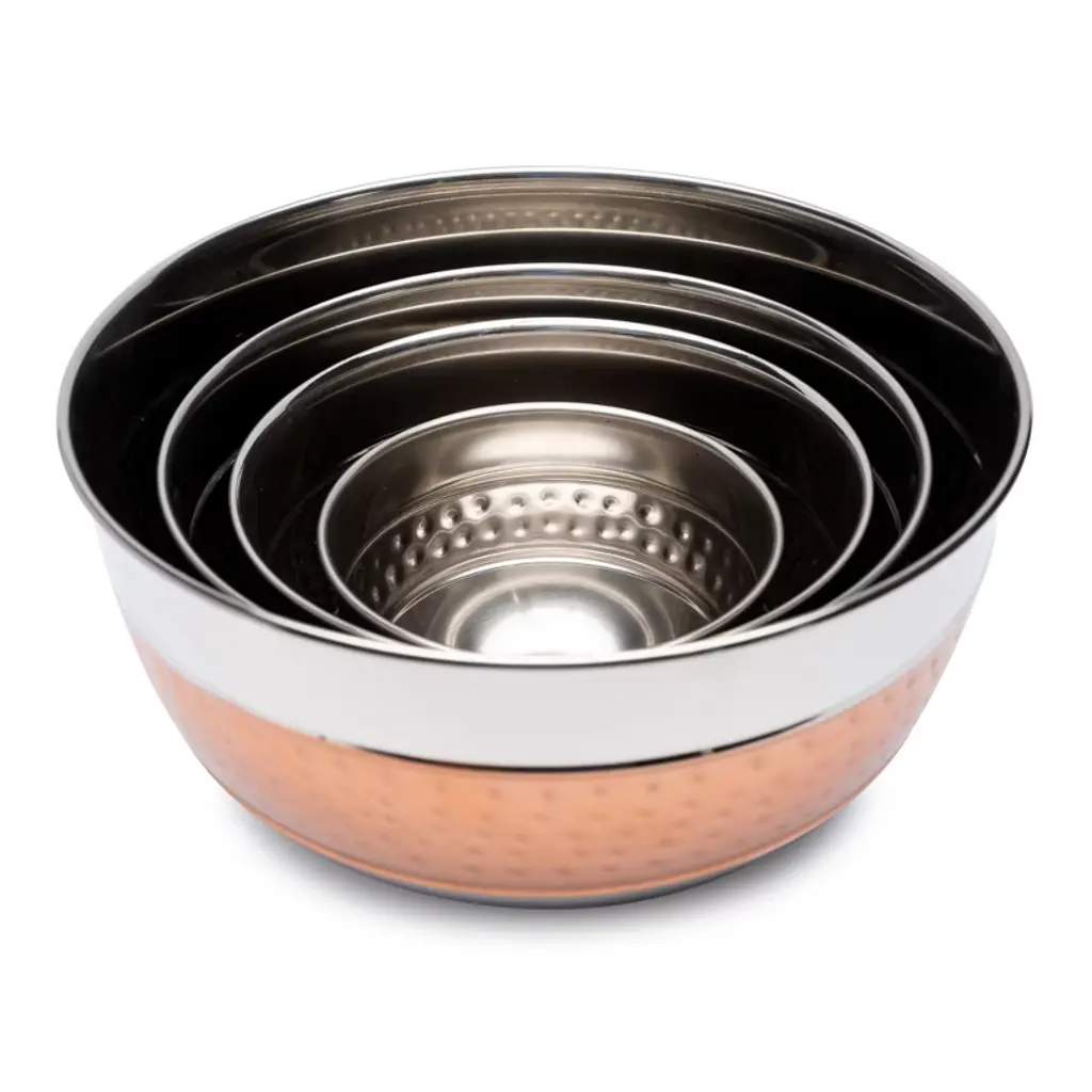 Whether you're serving snacks or blending ingredients, the Lexi Home hammered stainless steel bowls allows you to do so with a contemporary flair. Constructed from stainless steel with a textured copper hammered finish, this set of four nesting bowls is an ideal addition to your kitchen. This set includes: (1) 0.75 qt (24oz) mixing bowl, (1) 1.8 qt (57.6oz) mixing bowl, (1) 3 qt (96oz) mixing bowl, and (1) 5 qt (160oz) mixing bowl.
