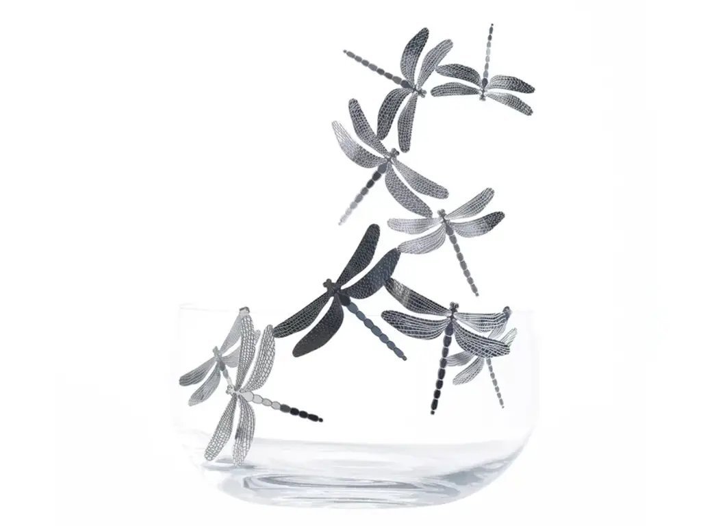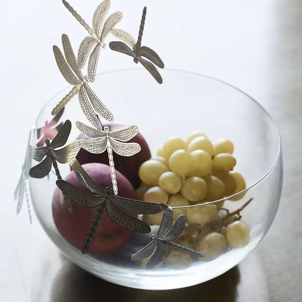 Designed by Gherardo Frassa for the Frutteti collection, this stunning bowl is made of Bohemian crystal and is decorated with removable dragonflies made of polished stainless steel, whose elegance and grace symbolize freedom, "libertà" in Italian. The dragonflies are exquisitely detailed with delicate engravings and seem to fly over the bowl with their fluttering wings. This sophisticated piece of functional decor will transform a classic crystal fruit basket into an art piece that can be displayed on a dining table or console to add a romantic touch into any interior.