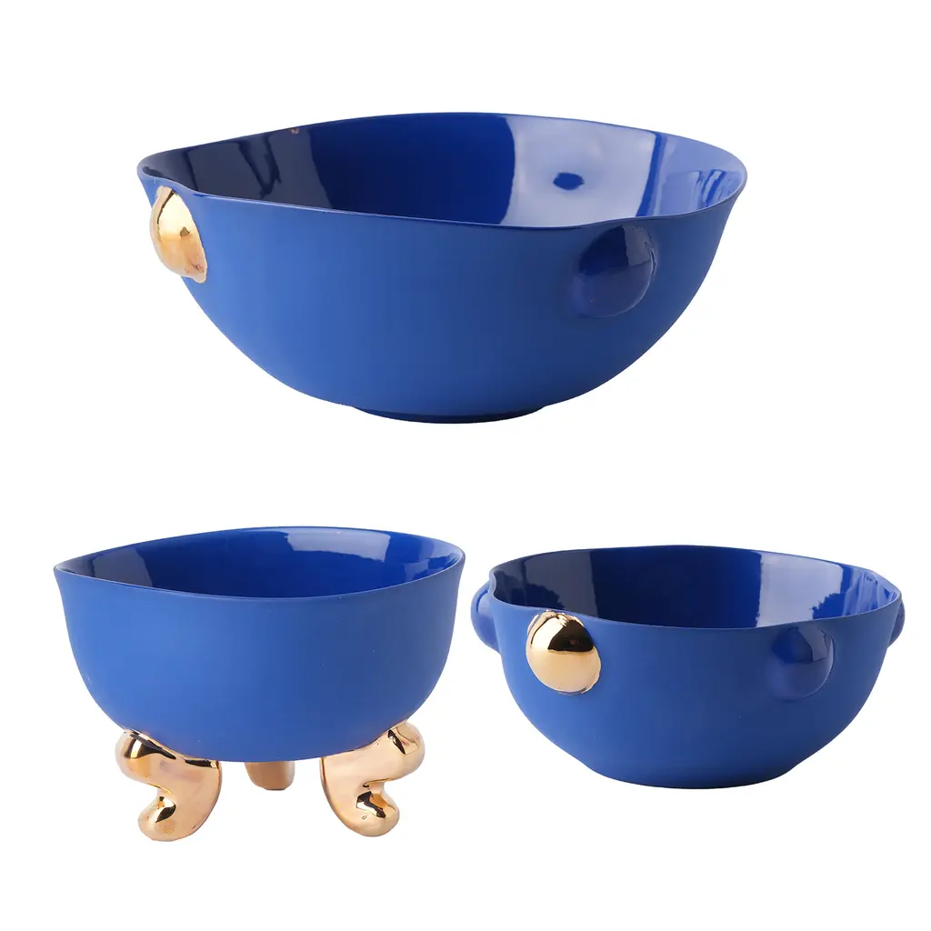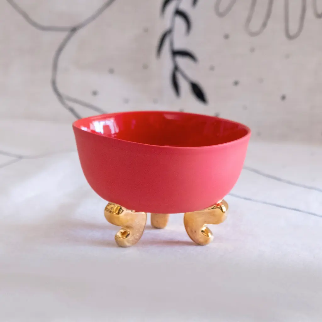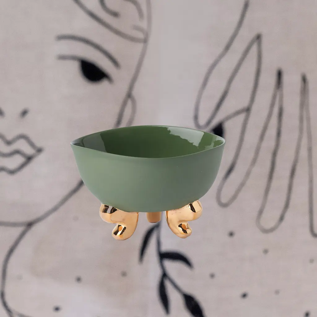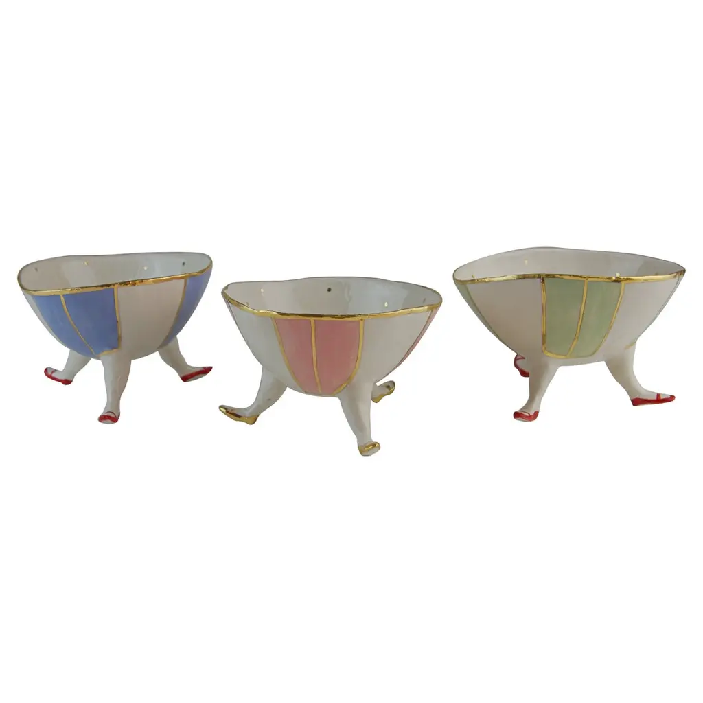 Handcrafted from fine Limoges porcelain and adorned with hand-applied 24-carat gold foot details, this whimsical bowl set brings artistic elegance and charm to any setting. Each bowl features a unique sculptural base inspired by antique lion feet, symbolizing strength and majesty.Perfect for serving fruits, nuts, or tapas, or simply as decorative centerpieces, these bowls can be styled together or individually. This four-piece set includes red, blue, green, and natural colorways — each with a distinct personality, yet united in timeless design and luxurious craftsmanship.