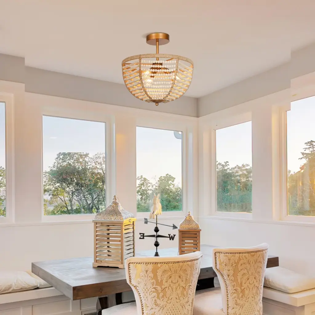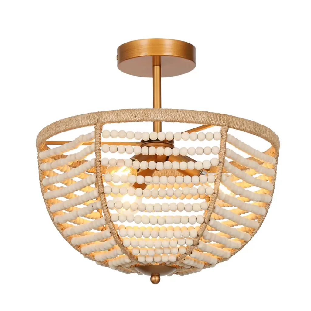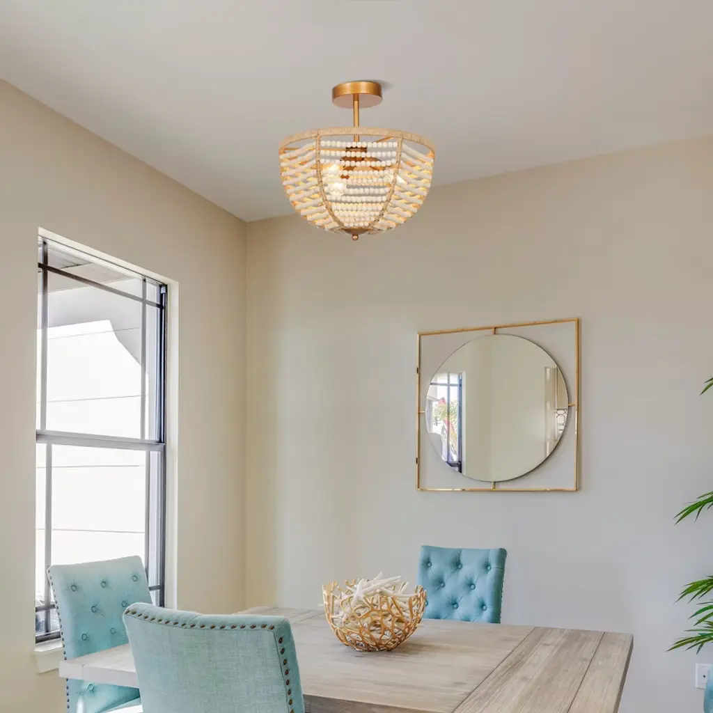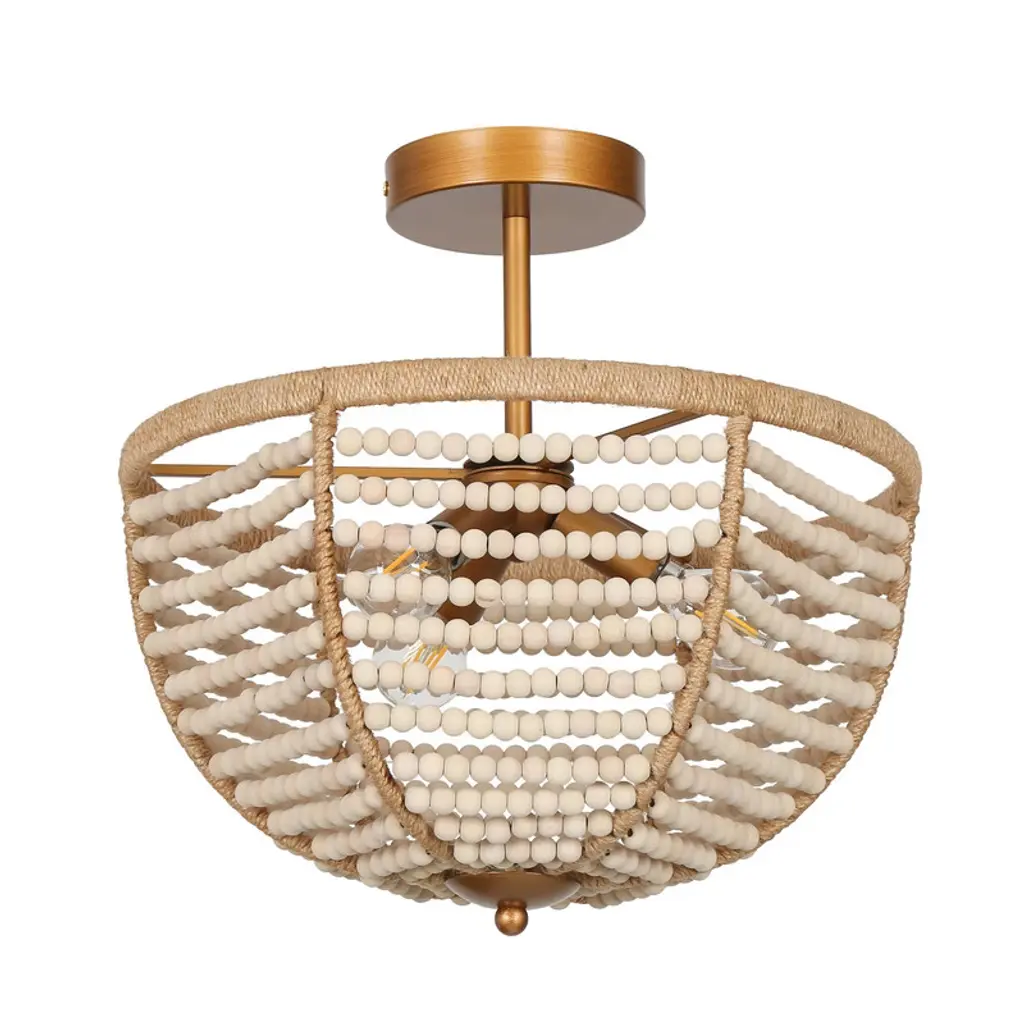 Infuse your space with coastal charm using this boho-inspired semi-flush mount ceiling light. Rows of hand-strung wooden beads drape gracefully around a warm brass frame, evoking the relaxed feel of a beachside retreat. Ideal for creating a natural, textural focal point in entryways, bedrooms, or cozy dining nooks. Compatible with dimmable bulbs for adjustable ambiance. Vintage filament bulbs recommended (not included).