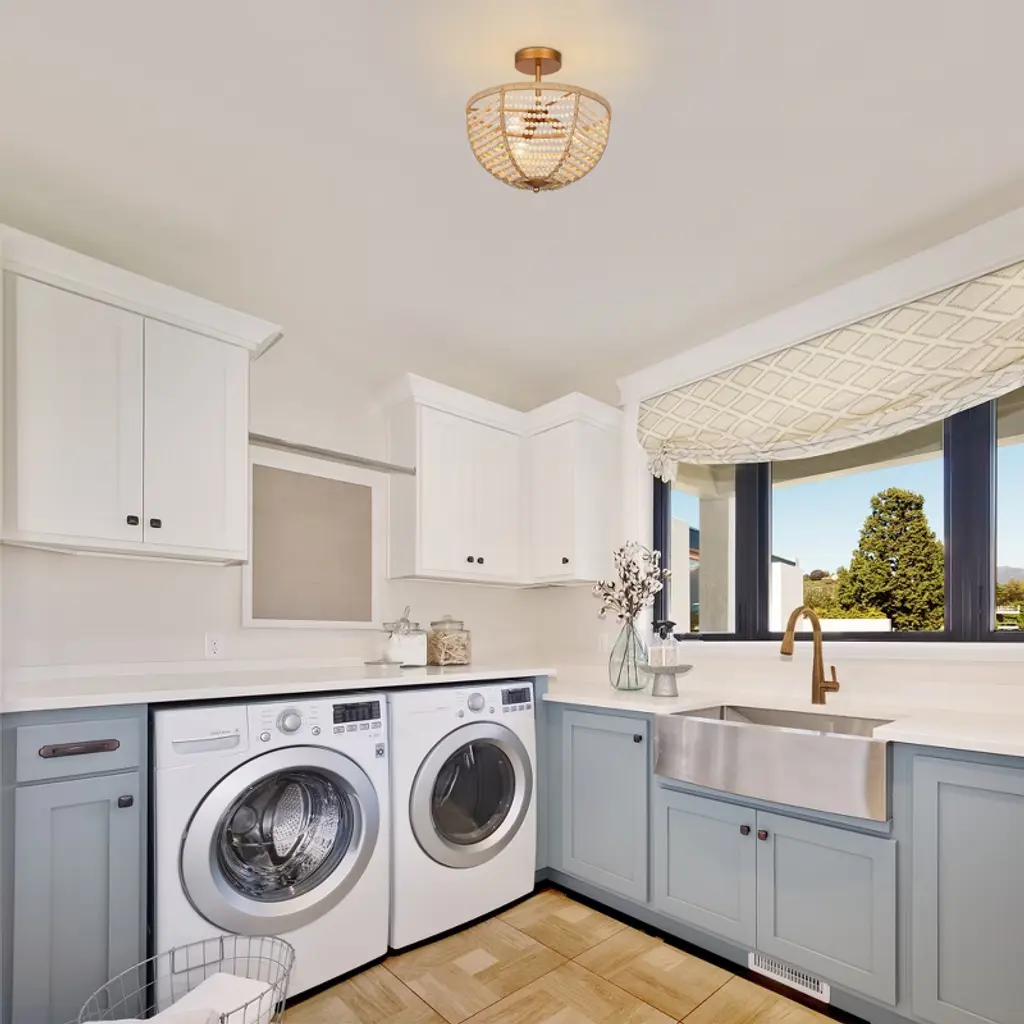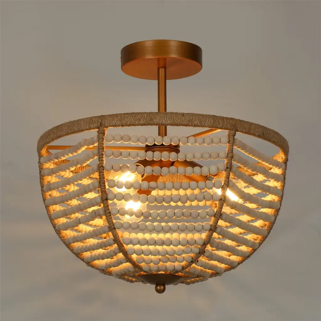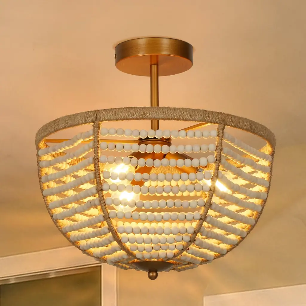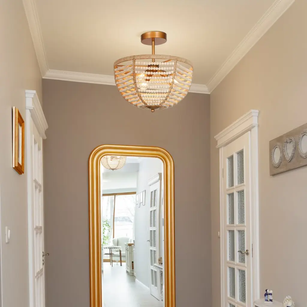 Infuse your space with coastal charm using this boho-inspired semi-flush mount ceiling light. Rows of hand-strung wooden beads drape gracefully around a warm brass frame, evoking the relaxed feel of a beachside retreat. Ideal for creating a natural, textural focal point in entryways, bedrooms, or cozy dining nooks. Compatible with dimmable bulbs for adjustable ambiance. Vintage filament bulbs recommended (not included).