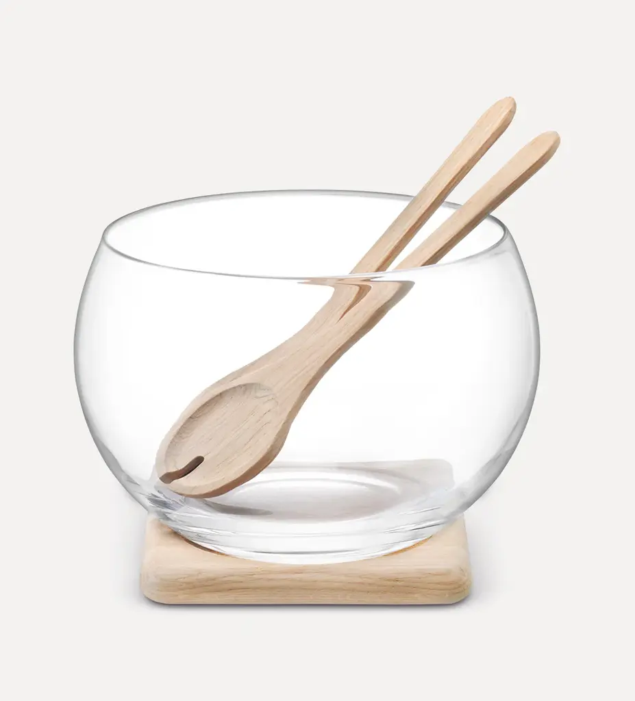 Say hello to the perfect salad bowl, the Lori Bowl Set. Complete with not only a stunning handmade glass bowl, it also comes with oak serving tongs and a matching oak base. The generous size of the bowl will enable you to serve guests and loved ones a delicious, large meal! Crafted from handmade clear glass + oak Dimensions: 10.5" Dia. x 7.25" H