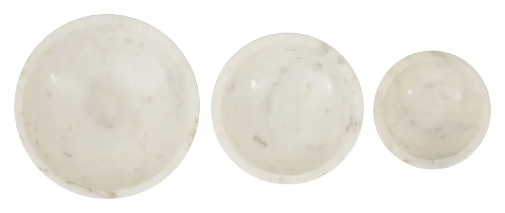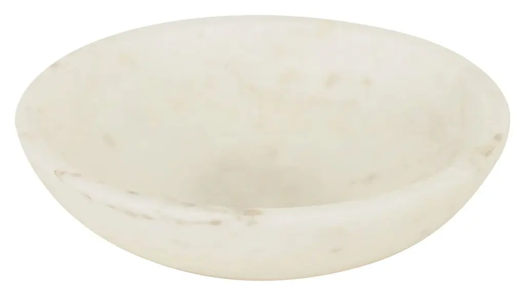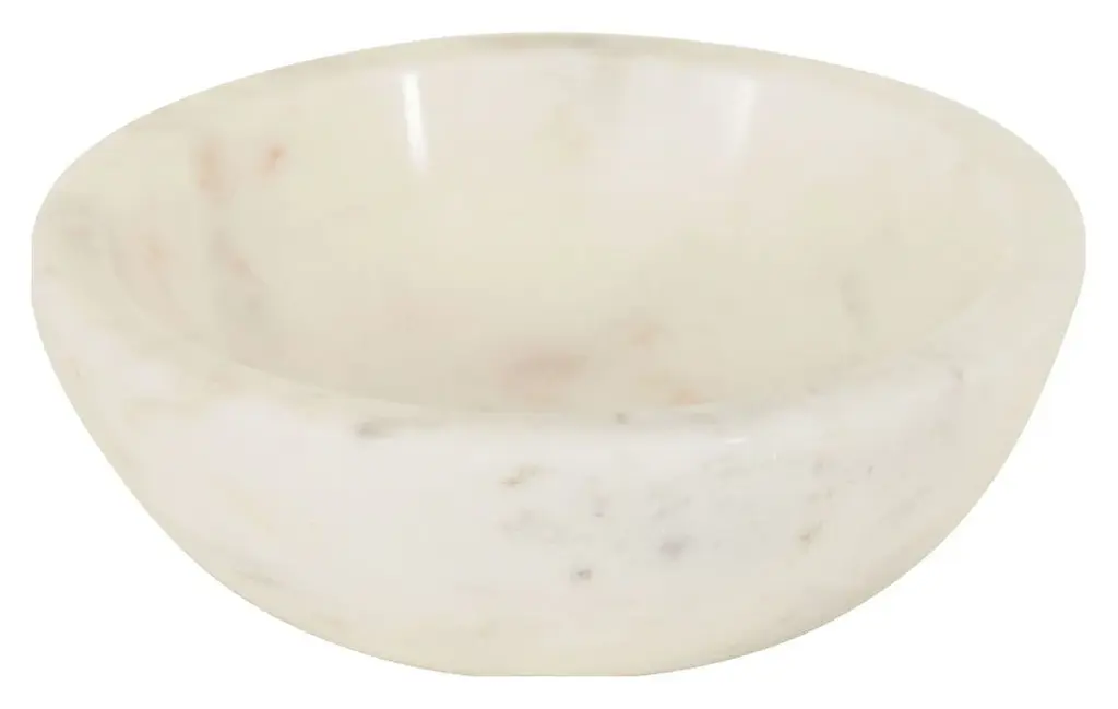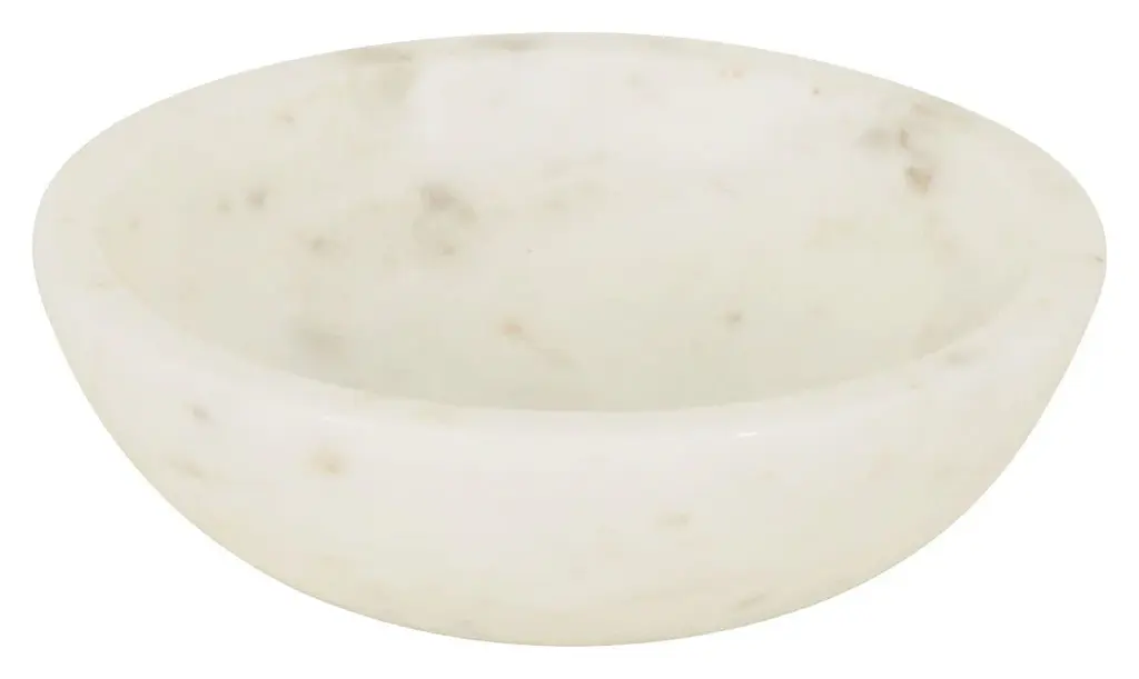 Our pretty little Low Marble Bowls make the perfect addition to any room of the house. Simple yet chic, these petite dishes are carved from white marble with organic swirls of soft grey veining. Stunning on their own, one of these versatile bowls would be beautifully functional as a salt cellar on the kitchen counter or as a jewelry catch-all on the dressing table. We also love a set of all three sizes for serving snacks, sauces or desserts at your next gathering. Crafted from natural stone, each one is completely unique. •white marble •food safe •hand wash only •each is unique Dimensions •small: 4" diameter x 1"H •medium: 5" diameter x 1"H •large: 6" diameter x 1.25"H