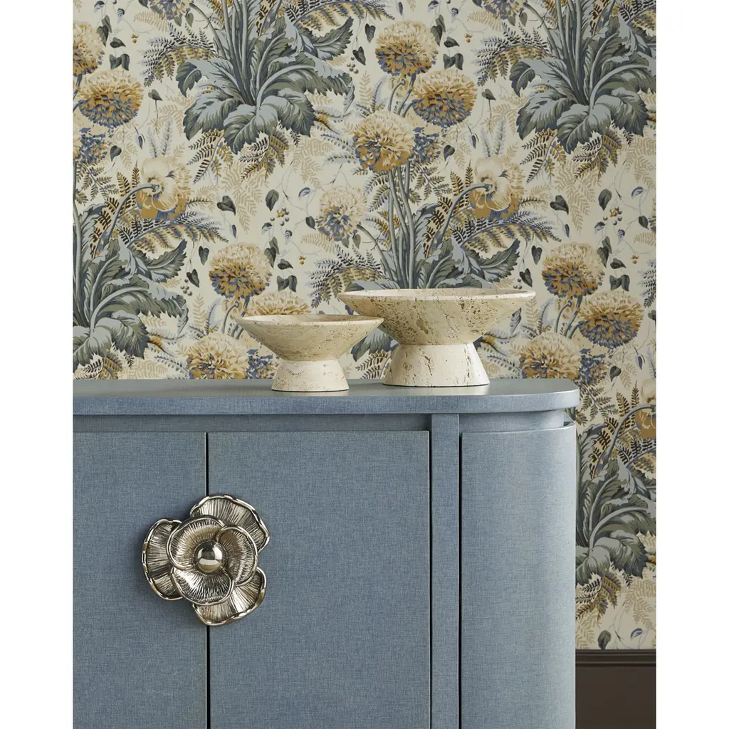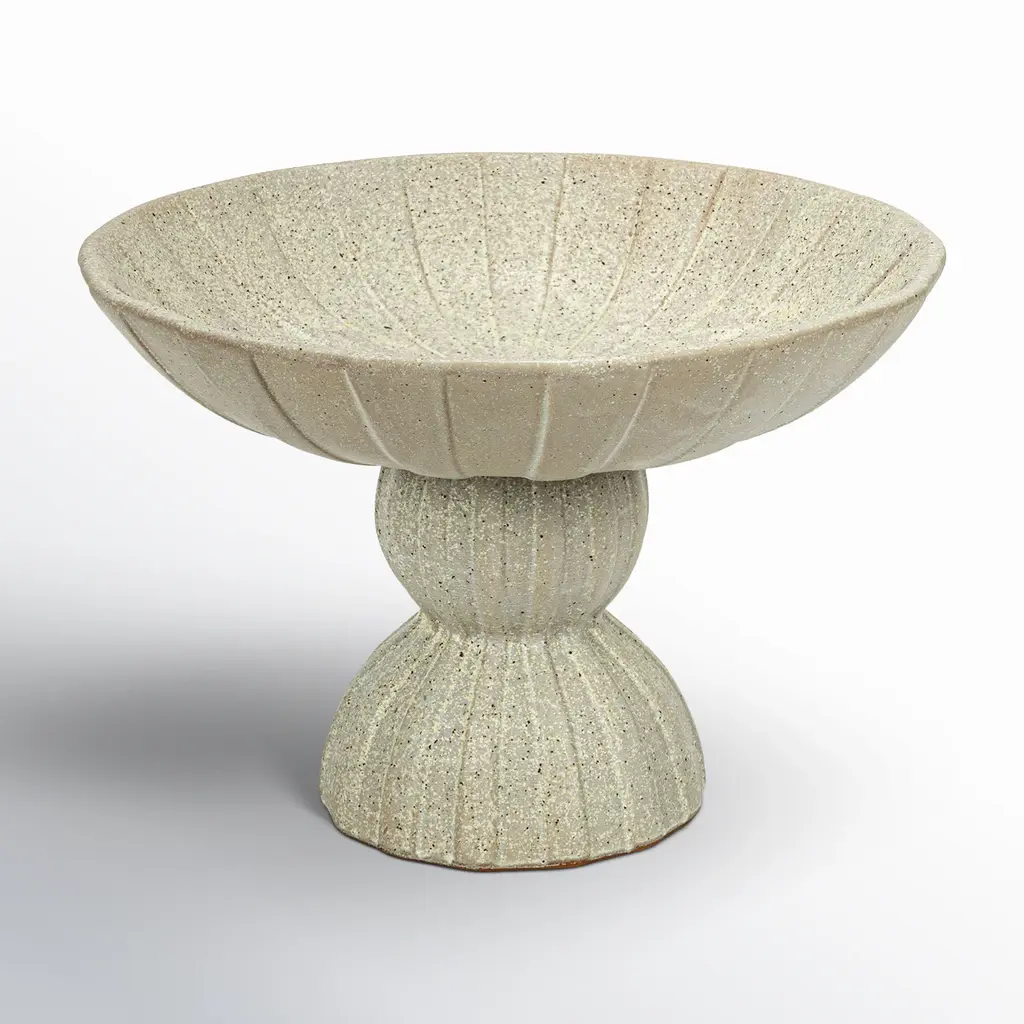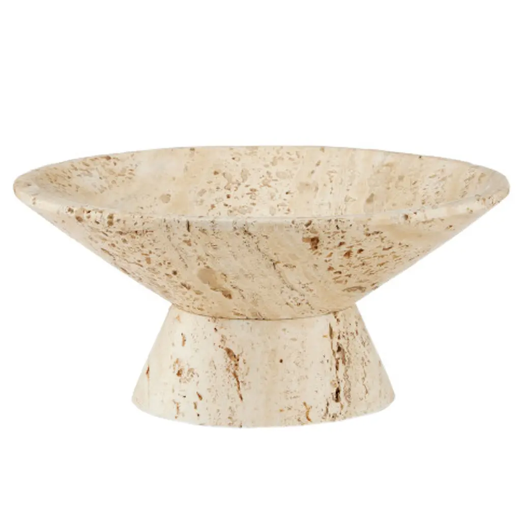 The Lubo Travertine Small Bowl is made of Travertine, which has a swirling personality as fluid as the shifting sands of the desert. The tan footed bowl will be a chameleon in an interior, as it will be just as fitting for holding decorative objects in a main living space as it will be for displaying brightly-colored ornaments during the holidays. The surfaces will vary from piece to piece.