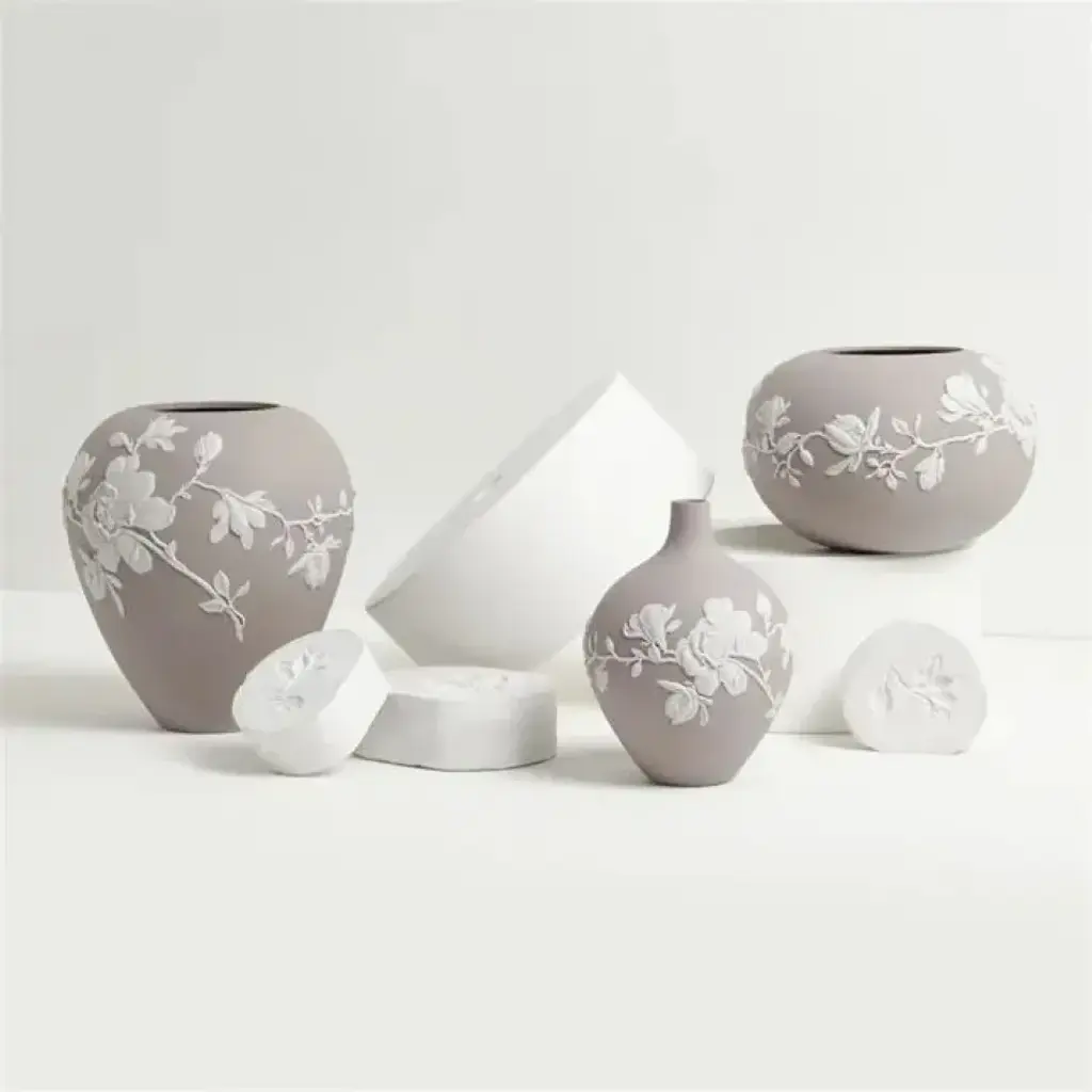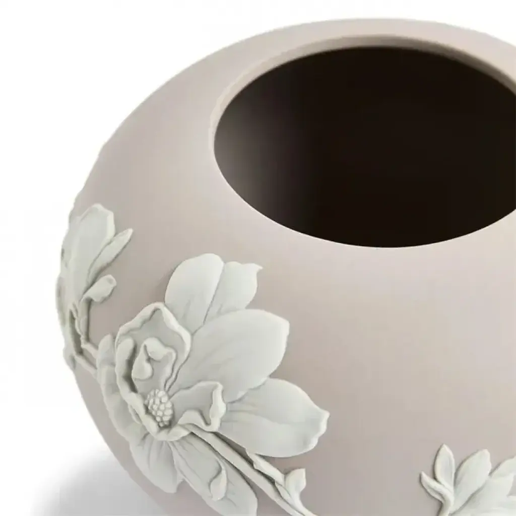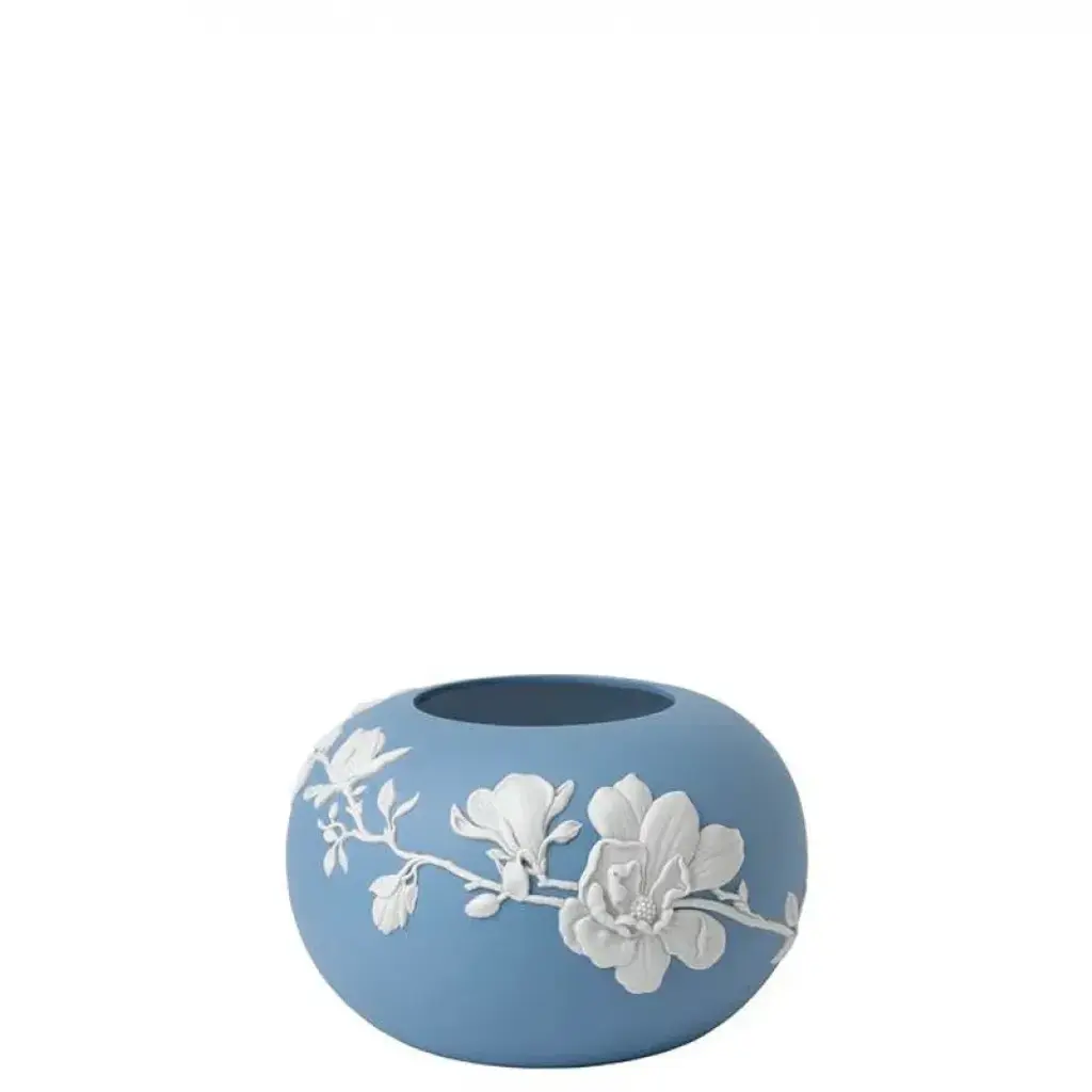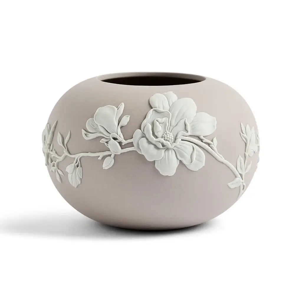 Experience the power of renewal and rejuvenation with the Magnolia Blossom Mink Rose Bowl. Handcrafted in England from Jasperware, this bowl features intricate white floral ornamentations on a mink base, adding a luxurious touch to any interior.