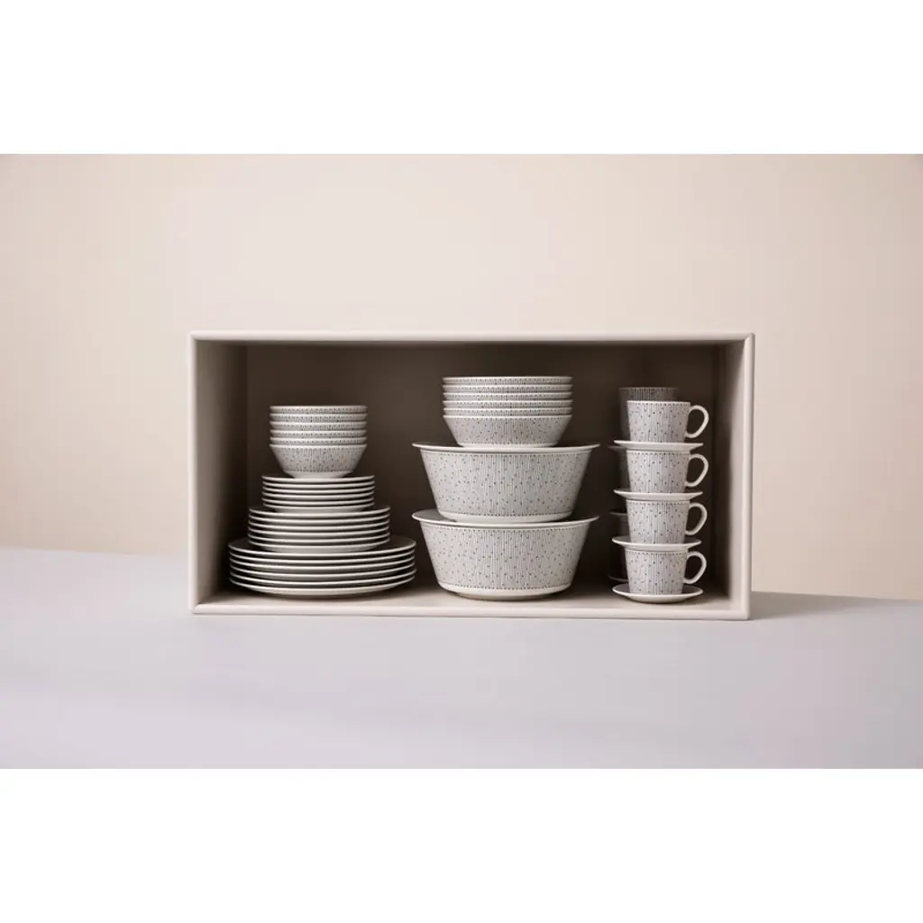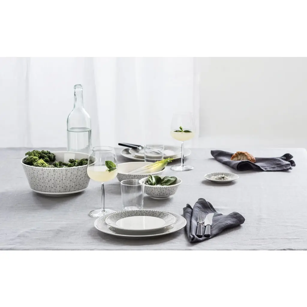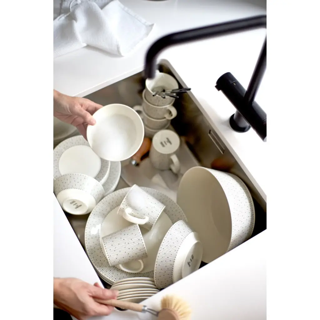 Arabia’s 5.12 in (13 cm) Mainio Sarastus bowl gives kitchens and table settings a touch of timeless Finnish design with a contemporary spirit. Mainio Sarastus is a tableware collection launched by Arabia in 2018, designed to bring beauty and practicality especially to small kitchens and urban homes. The most essential elements in its product design were versatility, durability and stackability: besides dining, the ceramic tableware is designed for preparing and storing food, and the plates can be used as lids for the bowls. Symbolizing the power of light, the Sarastus (”dawn”) pattern was inspired by Raija Uosikkinen’s Ivalo decoration from 1965, with its rhythmic lines arranging into a new, fresh shape. The lightweight and stackable Mainio Sarastus cups, bowls and plates are dishwasher-proof and suitable for the oven as well as the freezer.