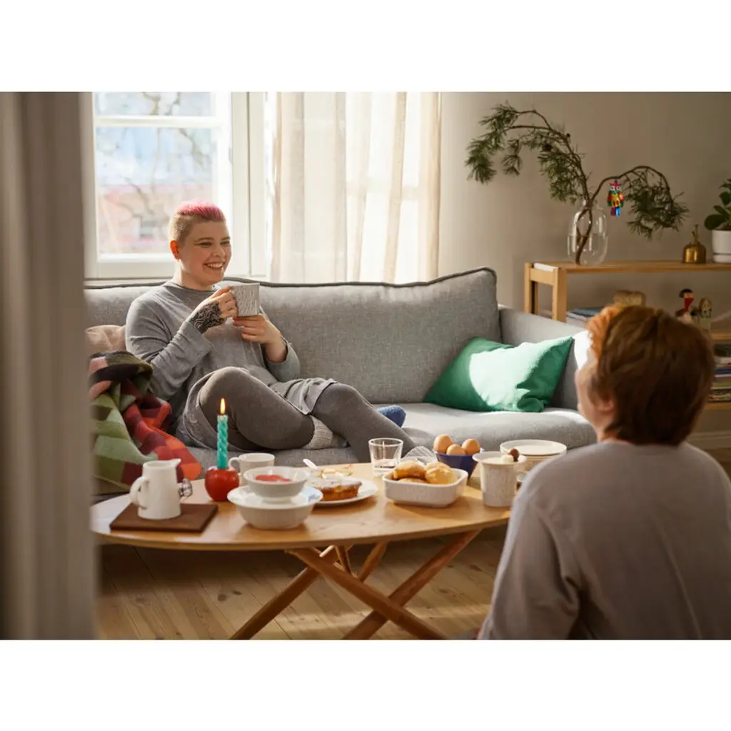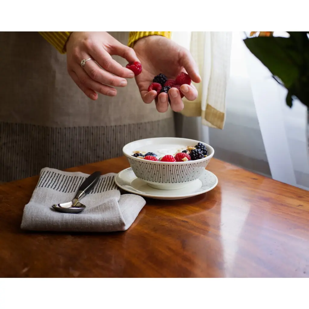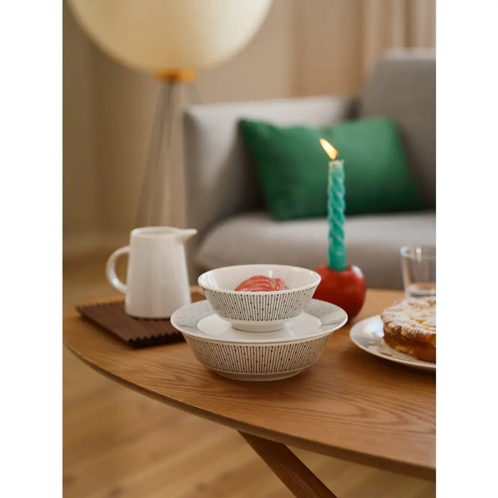 Arabia’s 5.12 in (13 cm) Mainio Sarastus bowl gives kitchens and table settings a touch of timeless Finnish design with a contemporary spirit. Mainio Sarastus is a tableware collection launched by Arabia in 2018, designed to bring beauty and practicality especially to small kitchens and urban homes. The most essential elements in its product design were versatility, durability and stackability: besides dining, the ceramic tableware is designed for preparing and storing food, and the plates can be used as lids for the bowls. Symbolizing the power of light, the Sarastus (”dawn”) pattern was inspired by Raija Uosikkinen’s Ivalo decoration from 1965, with its rhythmic lines arranging into a new, fresh shape. The lightweight and stackable Mainio Sarastus cups, bowls and plates are dishwasher-proof and suitable for the oven as well as the freezer.