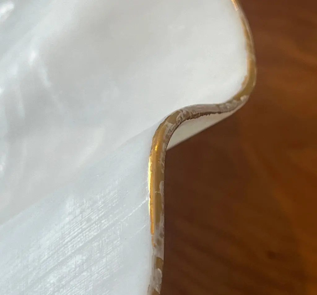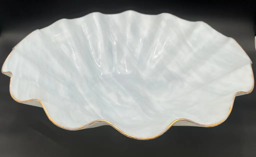 This decorative marbled glass scallop bowl combines modern design with timeless elegance. It is handcrafted from high-quality glass and has a delicate gold rim. The glass has a marbled texture made from two different types of glass, each with varying degrees of opacity. The glass's natural opacity gives the bowl a distinct character through the surface on which it is placed.Each bowl is crafted individually, requiring three firings to achieve the desired shape and finish. It is designed and painstakingly made by hand by artisans in Brooklyn, New York's historic Red Hook waterfront. This piece represents the work of an ever-shrinking craft that Flickinger Glassworks strives to keep alive and pass on to future artisans.It makes an elegant statement, standing 5.5" tall and 18.5" in diameter.