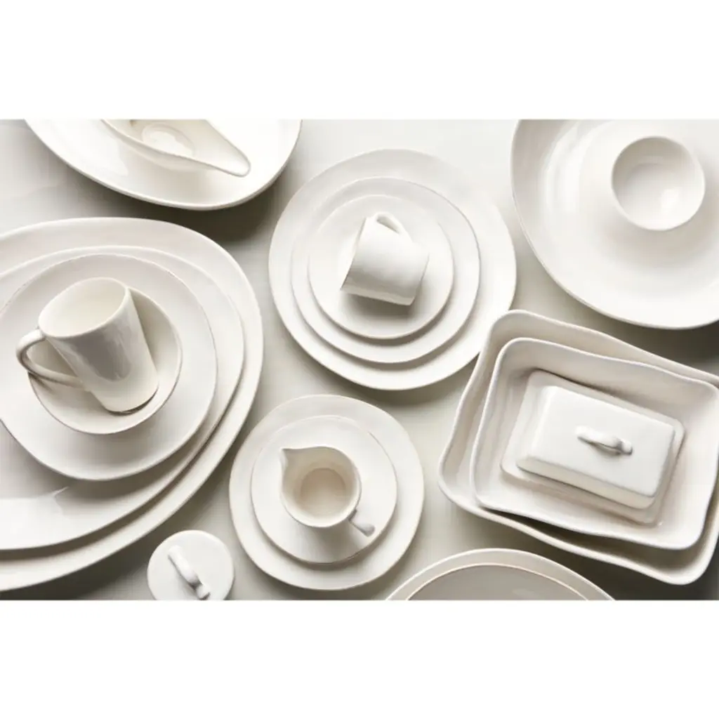 Artisanal ceramic low bowls are glazed a soft white with subtle hand-antiquing on the freeform rims. The unique form suits organic modern tables and is plenty chic for elegant occasions, while the durable stoneware is sturdy enough for use every day. For a coordinated dining experience, set a table with our Marin dinnerware and other serving pieces, all Crate and Barrel exclusives.
