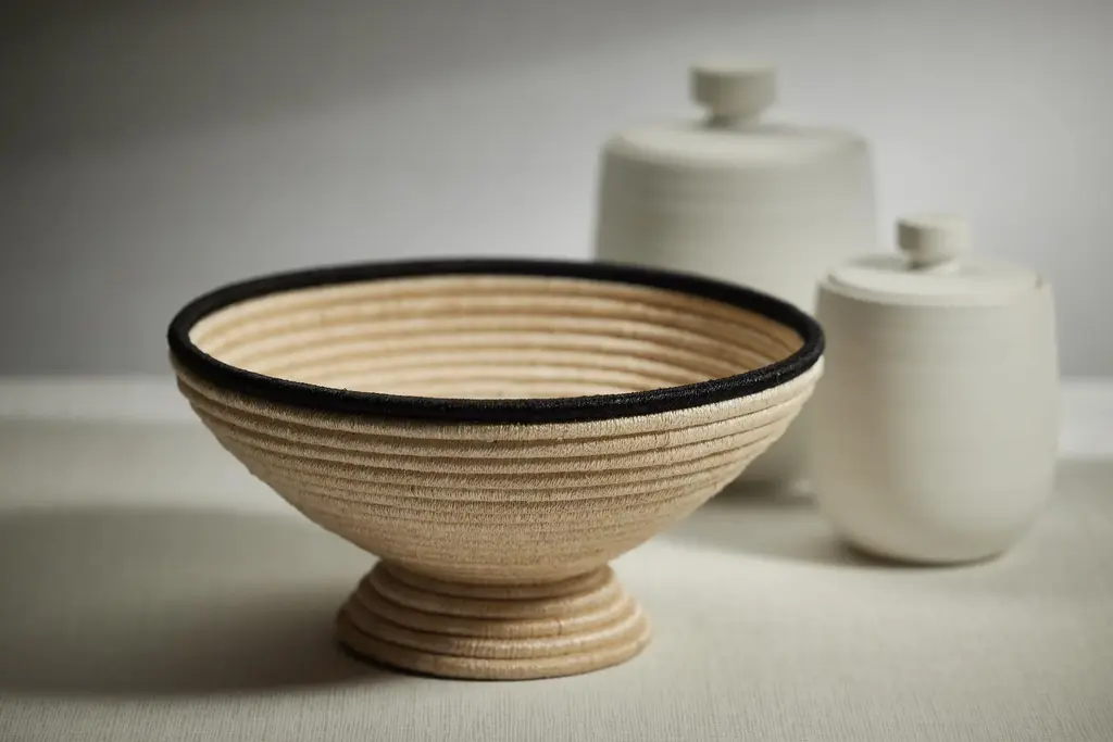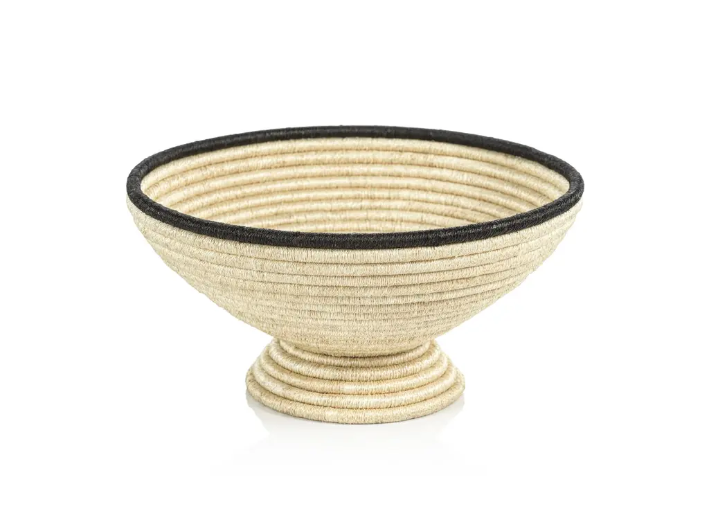 This pedestal abaca is a one-of-a-kind decorative piece in neutral hue with black colored rim and is made with a traditional coil technique that makes each bowl unique. This hand-woven bowl will create dimension and height to your table or buffet, while adding beautiful texture appeal for visual interest. Care Instructions: Clean with soft cloth Assembly Required? No