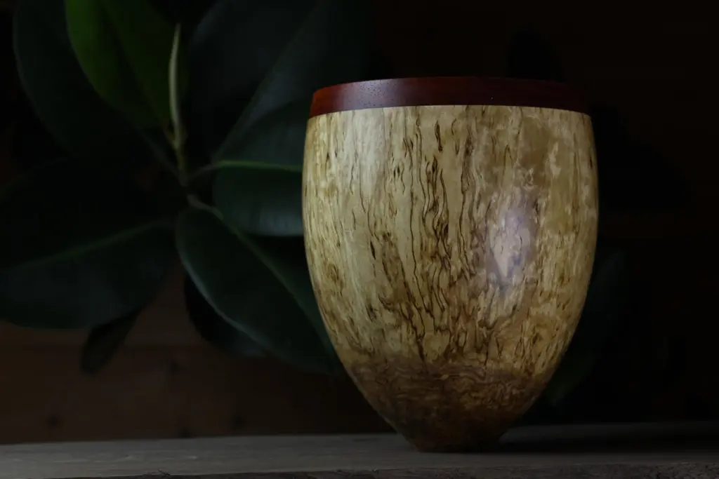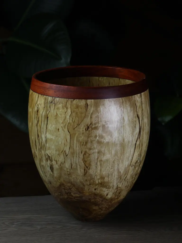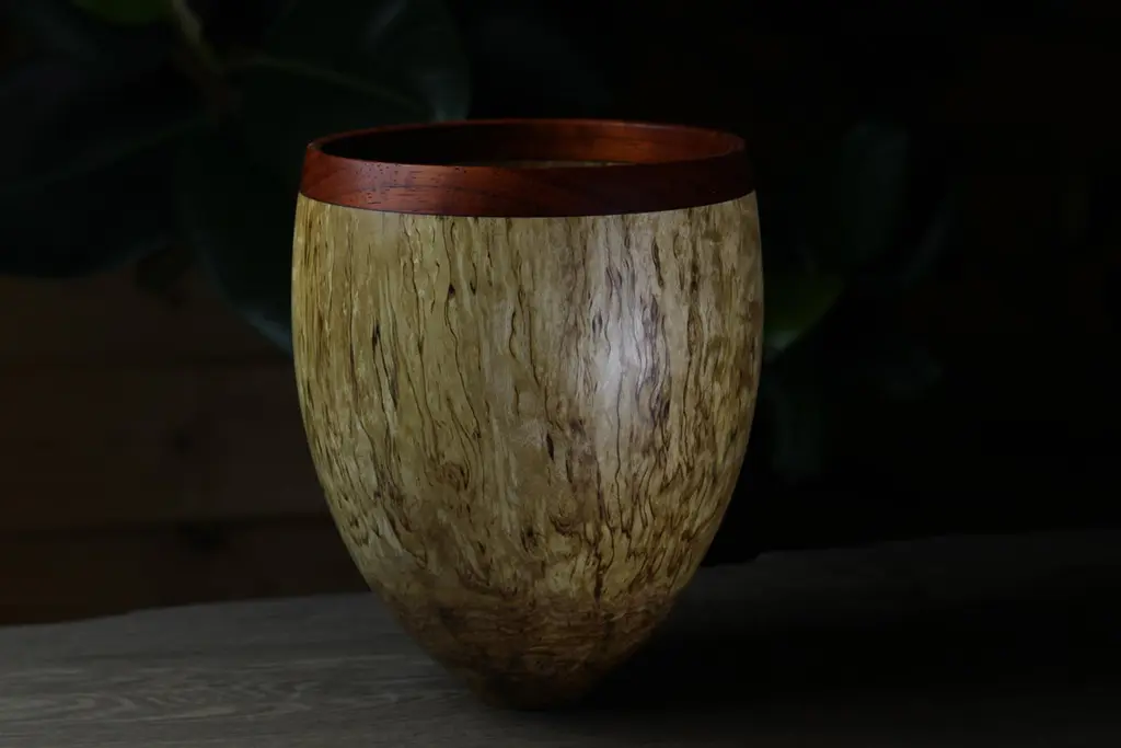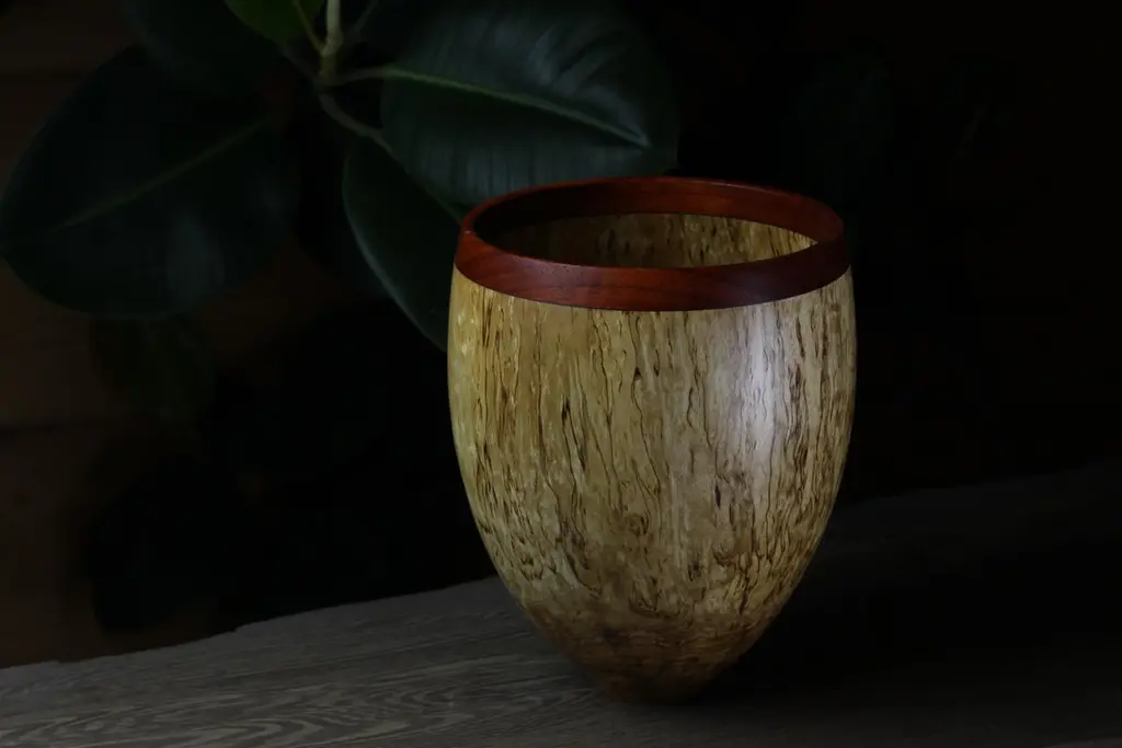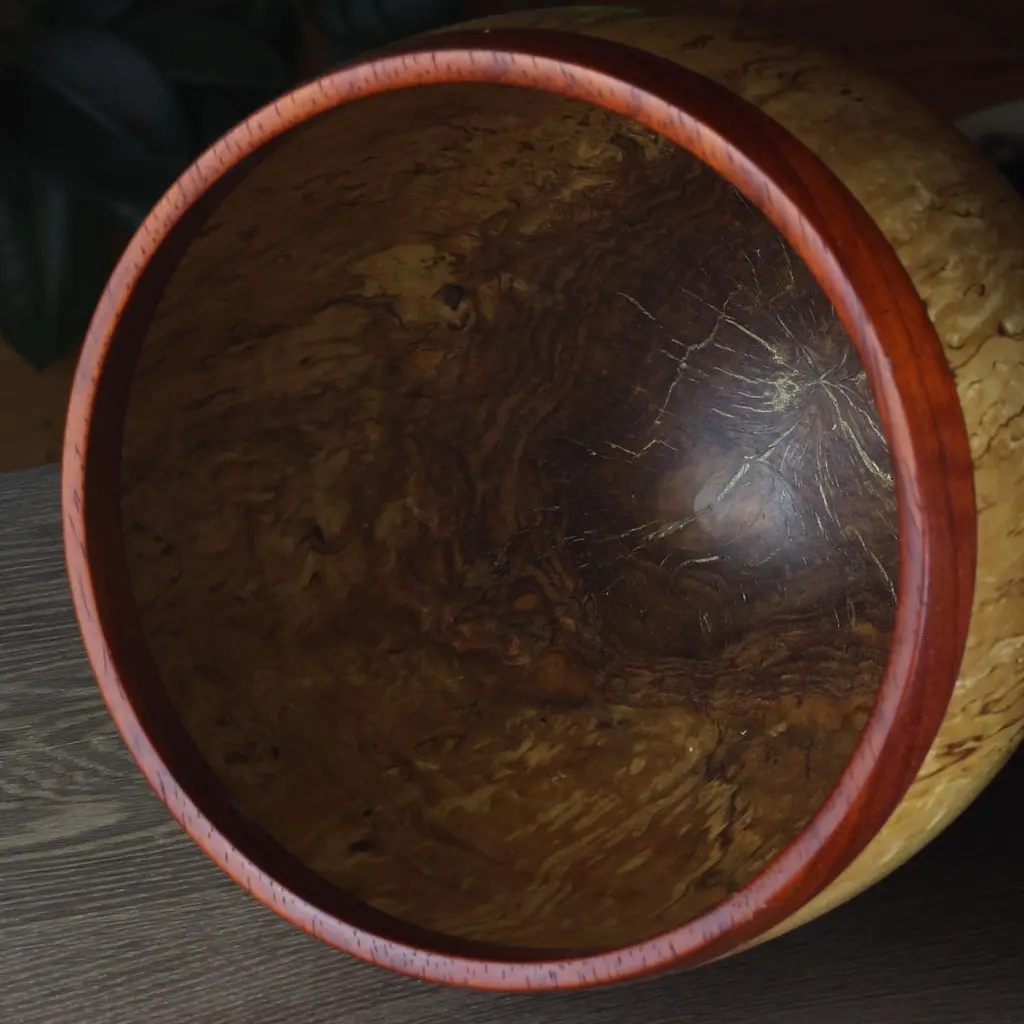 Masur birch bowl by Vlad Droz.Dimensions: D21 x H17 cm.Materials: Masur birch, Padouk.One of a kind. Vlad Droz"An incredible variety of forms of living creatures: animals, flowers, mushrooms, herbs, and of course trees reigns on our planet. This is a surprisingly diverse world. Once I touched wood, I began to recognize its structure and properties, as the structure of an organic life form with many external beautiful manifestations in textures, colors, tactile sensations.I am happy that I can see it all, and even happier than the opportunity to share it with other people, revealing for everyone the beauty of nature"Vlad Droz, was born in the Russian city of Ivanovo on August 8, 1985.He studied at the Ivanovo University of Architecture and Civil Engineering as an architect. In 2006, he became interested in playing the national instrument of the natives of northern Australia - yidaki / didgeridoo - subsequently it affected his whole life. Almost immediately engaged in the manufacture of wood. He had experienced for years different techniques in order to master the Craft as he does nowadays. He is recognized as one of the most important wood sculptor of the Russian young generation artists.
