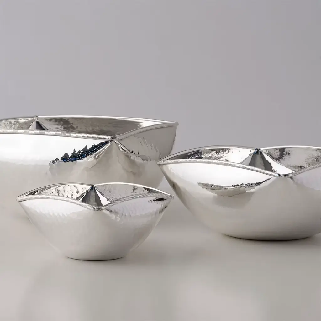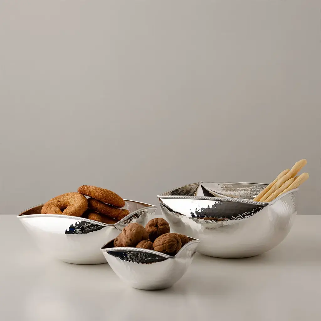 The Materia Viva bowl is an enveloping piece, shaped from the fusion of a circle and a square, with a surface showcasing exquisite hand-hammered craftsmanship. The result is a soft, textured, and timeless object that seamlessly complements any interior style. Whether used alone or as part of a set, it serves as a refined accent for displaying fresh fruit, bread, and pastries on your elegantly set table. This piece is a sophisticated statement of fine Italian silversmithing. Available in other sizes upon request, please contact the Concierge for more information.