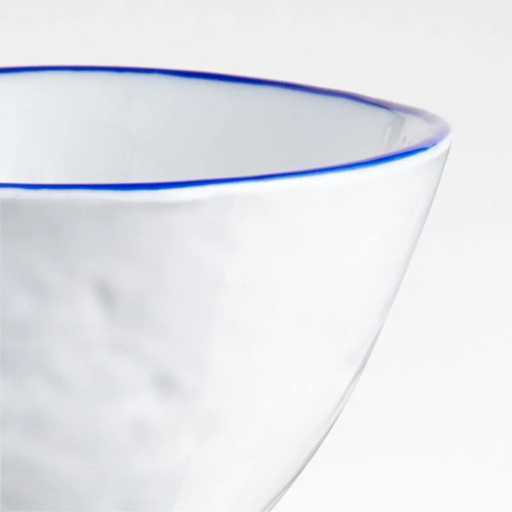 Outlined in blue, our contemporary Mercer porcelain whiteware represents a fusion of refinement and rusticity. This mini bowl takes on organic overtones with a freeform rim and finely "hammered" surface that ripples the light. Offering crisp contrast to the snow-white glaze, the blue rim brings a classic bistro vibe to low-key meals and smart dinner parties. The bowl is perfectly sized for serving dips, crudites, olives and snacks. Smooth enough to not harm tables, the bowl's unglazed ceramic bottom gives each piece an artisanal look.