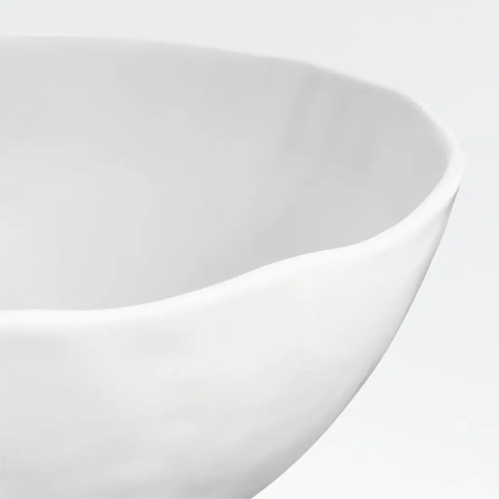 Contemporary porcelain whiteware represents a fusion of refinement and rusticity. The slim profile of these eight low bowls takes on organic overtones with freeform rims, a matte white glaze and finely "hammered" surfaces that subtly ripple the light. Smooth enough to not harm tables, the unglazed ceramic bottoms give each piece an artisanal look.