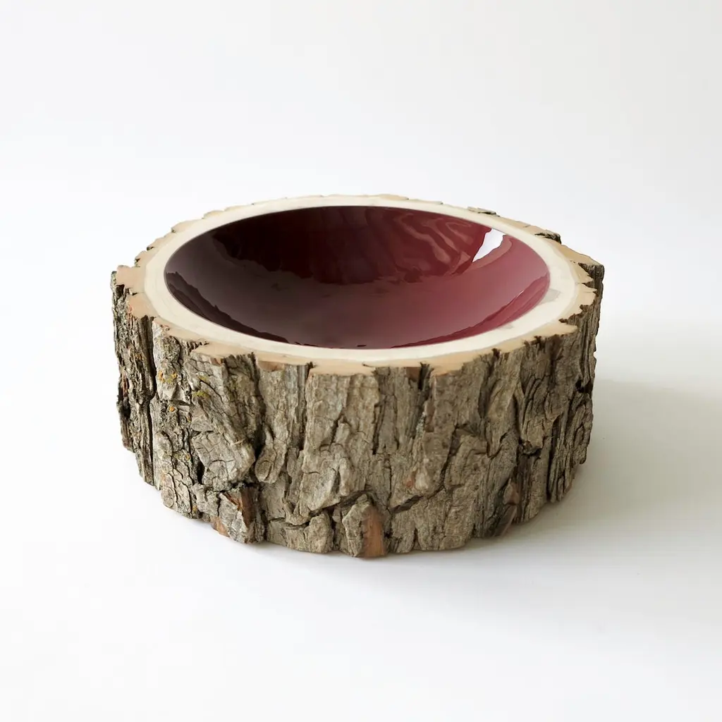 Perfect as a feature objet d'art on your table or shelves, a catch-all for jewellery and special items, or displayed as a group for a striking centrepiece. Each Log Bowl is unique and makes the perfect one of a kind gift.Log Bowls combine the beauty of a tree in its natural state with a high-gloss, vibrant finish. Each bowl is handmade using locally reclaimed trees of all varieties (fallen or cut down due to infrastructure or inclement weather). The trees are hand selected, gathered, turned and finished by Loyal Loot and local artisans. Log Bowls come in a wide variety of colours and are refined by hand with a water-based, furniture grade finish.This Merlot custom coloured bowl will brighten any space. Intended for use with dry goodsMaterials and Process: Reclaimed logs, Air dried, turned on a lathe, hand painted with a water-based gloss varnish.Heights vary from 3.5"- 5"Available in Willow Wood or Poplar Wood.