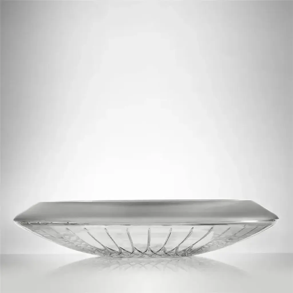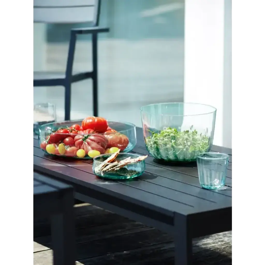 A small, low bowl with a subtly fluted texture. Mouth blown from 100% recycled glass, the glass has a subtle green tint with a few air bubbles present, characteristic of the handmade process. For displaying and serving olives, nuts, berries or sweets.