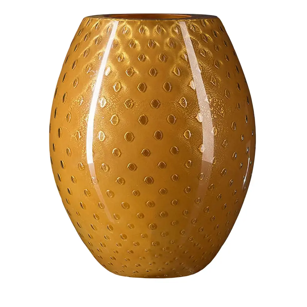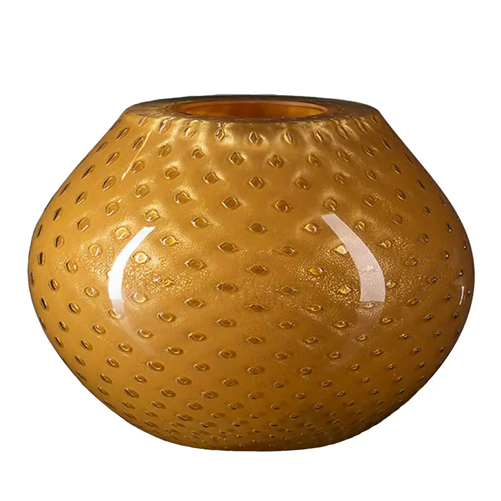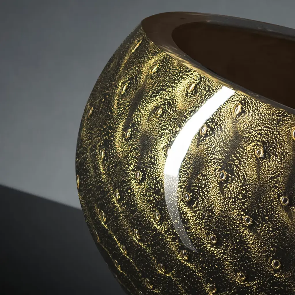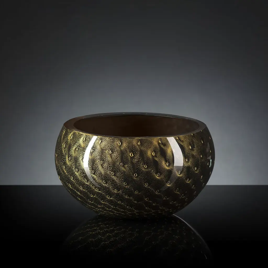 This one-of-a-kind bowl exemplifies the timeless and unrepeatable charm of mouth-blown Murano glass. Accented with black and golden hues complemented with a captivating dotted design, it is completed by a glossy finish that seals the elegance of the piece. Please consult the Concierge for the wide variety of available color options to best fit the desired interior palette.