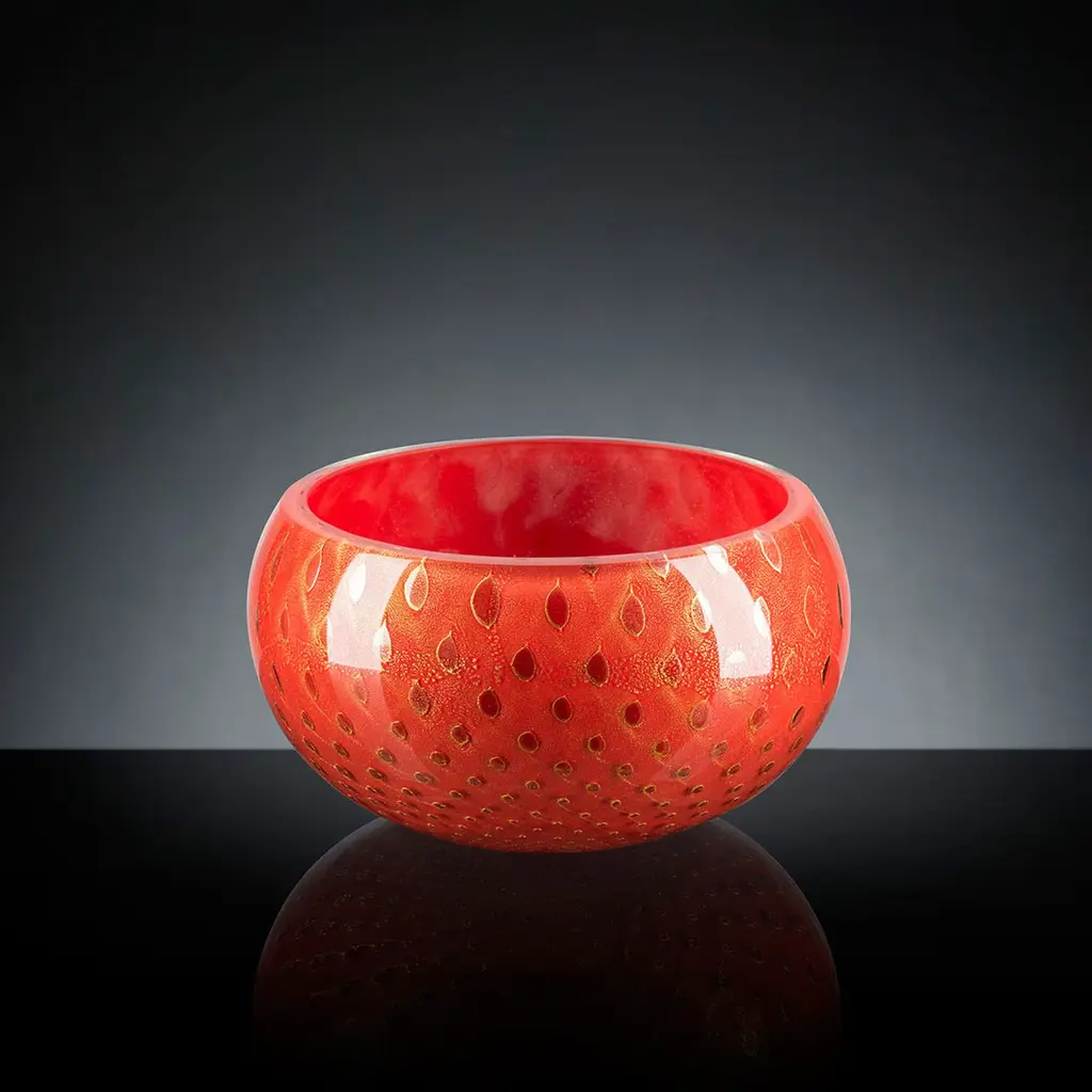 A gem of glassblowing artistry, this bulging bowl crafted of Murano glass stands out for its aesthetic coupling a vivid red tone with shimmering accents of gold. A pattern of dots and drop-like elements adorns the exterior, showcasing singular details revealed during the artisan crafting process. Other colors can be found in the Artemest catalog.