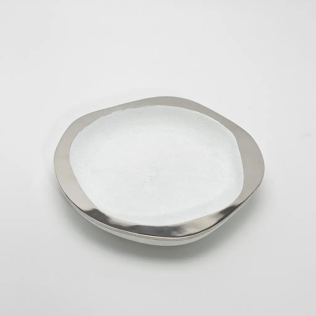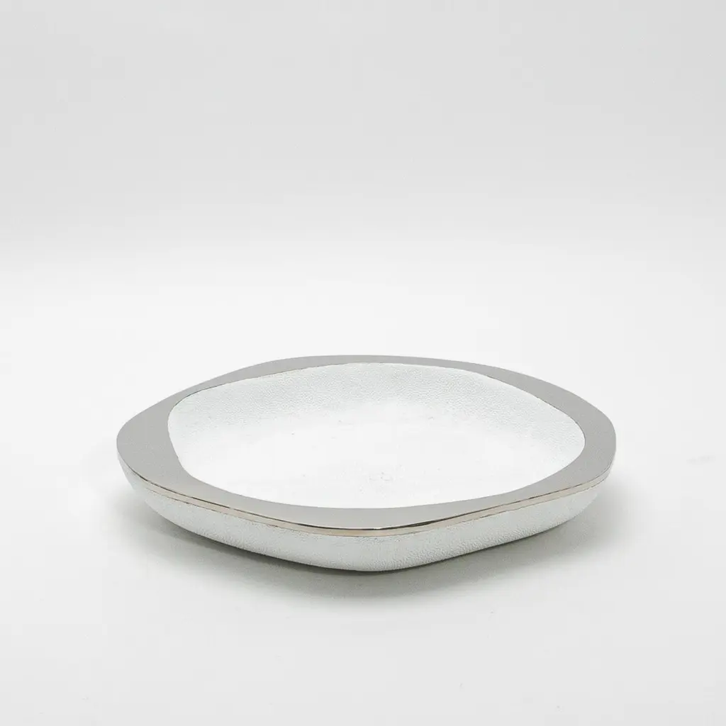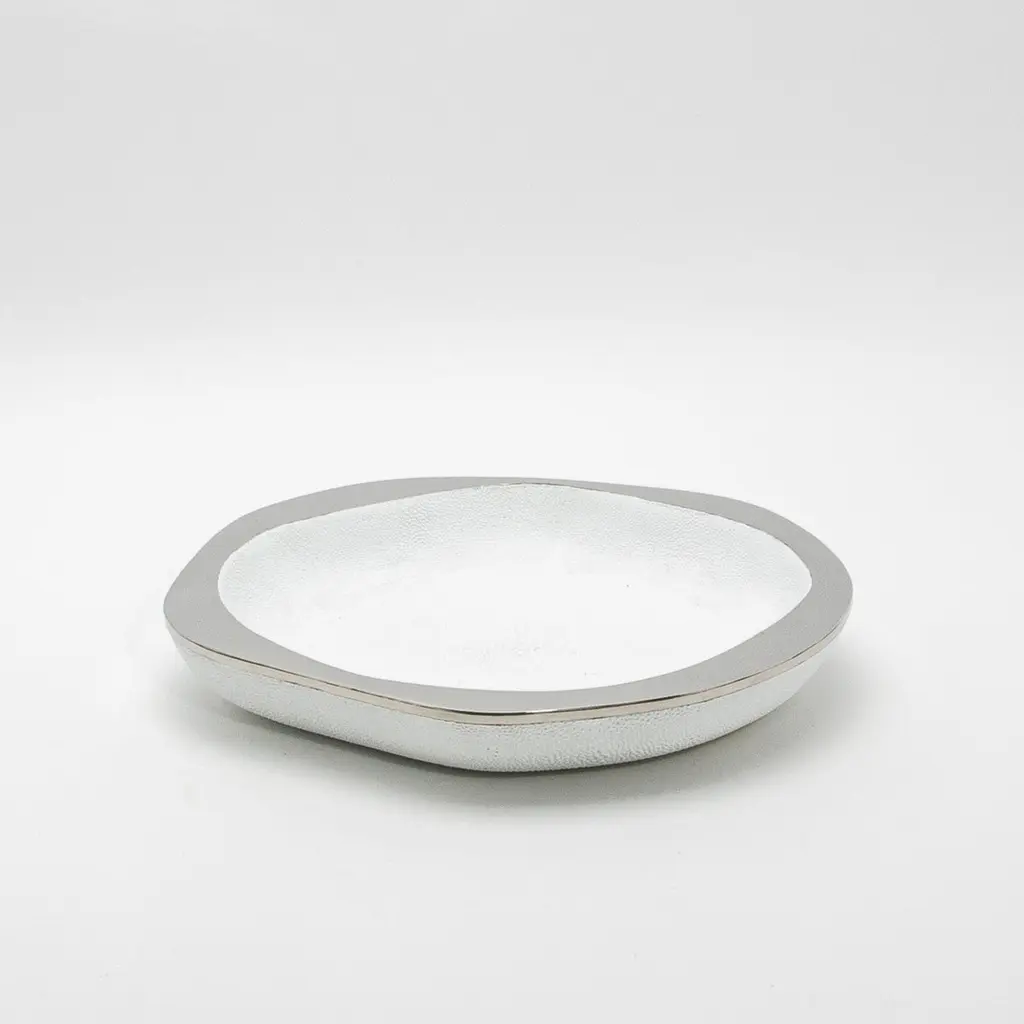 The White Shagreen & Stainless-Steel Lily Bowl L by R&Y Augousti is a stunning fusion of contemporary elegance and artisanal craftsmanship. The bowl’s textured surface, crafted from luxurious white shagreen, contrasts beautifully with the sleek, polished stainless-steel rim, creating a refined yet dynamic aesthetic. Handcrafted with meticulous attention to detail, the soft curves and organic shape give the piece an inviting, tactile quality, while the lustrous materials catch the light, elevating any space it graces. This bowl comes in different finishes and sizes. This one is size Large.This item is on display in our LA showroomColor variants may occur on the stingray and other exotic finishesClean with soft dry clothAbout R&Y AUGOUSTI:R&Y Augousti, created by the visionary husband-and-wife duo Ria and Yiouri Augousti, epitomizes the pinnacle of luxurious, globally inspired design. Since its inception in Paris in 1989, the brand has become synonymous with opulence, distinguishing itself through the masterful integration of shagreen with brass and other exotic materials. Each piece in their Art Deco-inspired collection is a testament to unparalleled craftsmanship, meticulously handcrafted by the finest artisans in the Philippines, ensuring that every creation is a unique masterpiece.Ria, hailing from Manila, and Yiouri, from Cyprus, share an exquisite passion for revivalist design, which has propelled R&Y Augousti to the forefront of luxury interiors. Their innovative use of materials, particularly the revival of shagreen, has set new standards in elegance and sophistication. The natural color variations on stingray and other exotic finishes further enhance the authenticity and bespoke nature of their designs.Today, R&Y Augousti’s collections grace the most exclusive showrooms in Paris, New York, and Los Angeles at the Pacific Design Center's MOGUL, continuing to redefine the essence of timeless luxury. Their work is not merely furniture; it is a celebration of art, craftsmanship, and the ultimate in refined living.
