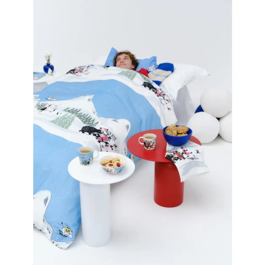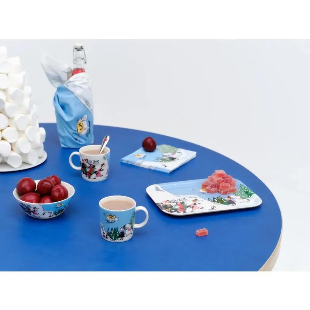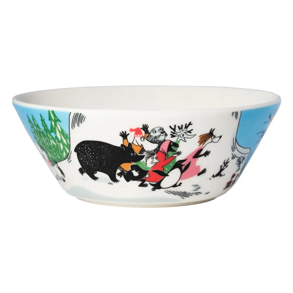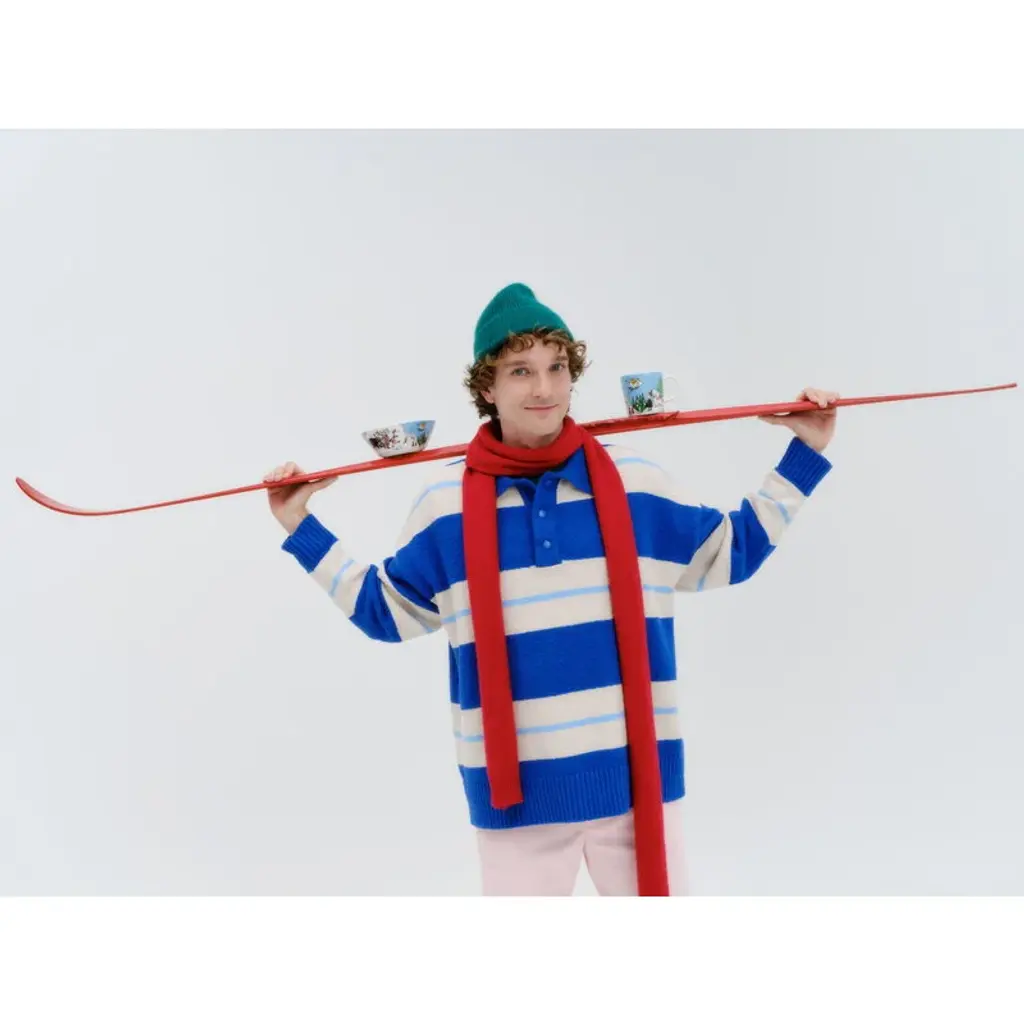 Moomin Arabia's Ski Jumping bowl is part of the seasonal Moomin collection for winter 2024. This Moomin bowl illustrates Moomintroll competing in the Moomins’ Winter Games. The daring jump, ending in the treetops, is all about impressing Snorkmaiden, who is watching from below. The artwork is based on Tove Jansson's comic story Moomin's Winter Follies from 1955. Moomin Arabia's winter collection is released each year at the beginning of winter and is available for a limited time only. Inspired by the wintery atmosphere of Moominvalley, these products feature cheerful characters drawn from Tove Jansson's original illustrations. The Moomin dishware uses Kaj Franck's Teema series, celebrated for its timeless and practical design.